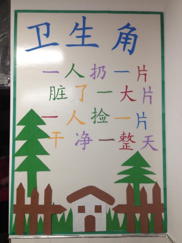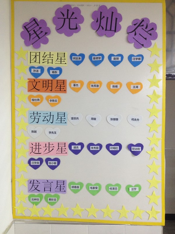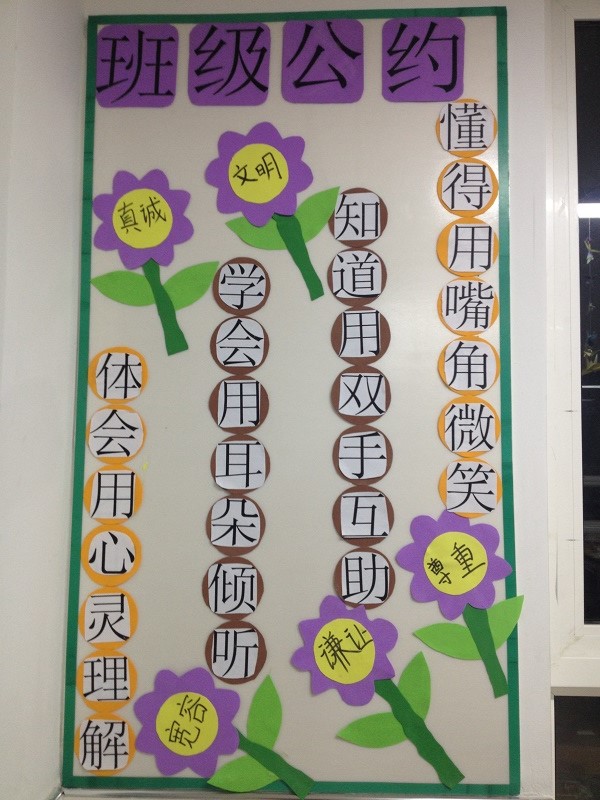 教室的两侧,是“卫生角”,“星光灿烂”和“班级公约”,’班级公约”是我们班级的公约,也是我们做人的公约,卫生角,提示我们班级的整洁靠每一个人的努力。