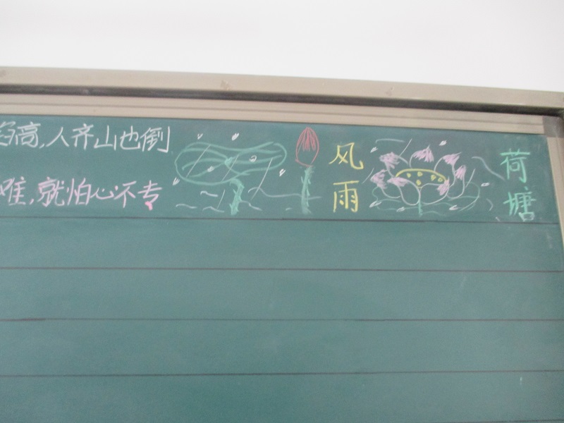 走进八一班的教室,映入眼帘的是小组展示用的黑板。黑板按照一定的规格画着十二条黑线。最上方分别是一个小组的组名及其布置,首先我们来,看一看“风雨荷塘’’组,美丽的荷花盛开在池中,旁边还有一片大荷叶亭亭净植,几滴雨斜洒荷塘,显出几分韵味。