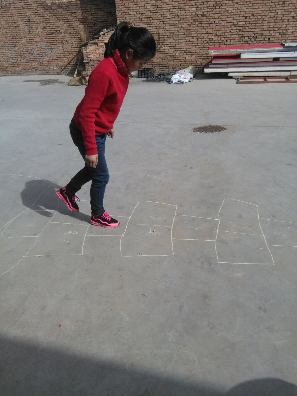 现在我们要开始玩了,第一个是我,我扔进去了,然后踩着2,3先是双脚,然后再是单脚,这样重复重复再重复,到头了,然后再返回来,到2,3格子的时候再捡起石头,这样就好了,接着再扔第二个格子,可惜我没扔进去,就让我的小伙伴去扔,也和我一样没扔进去。
