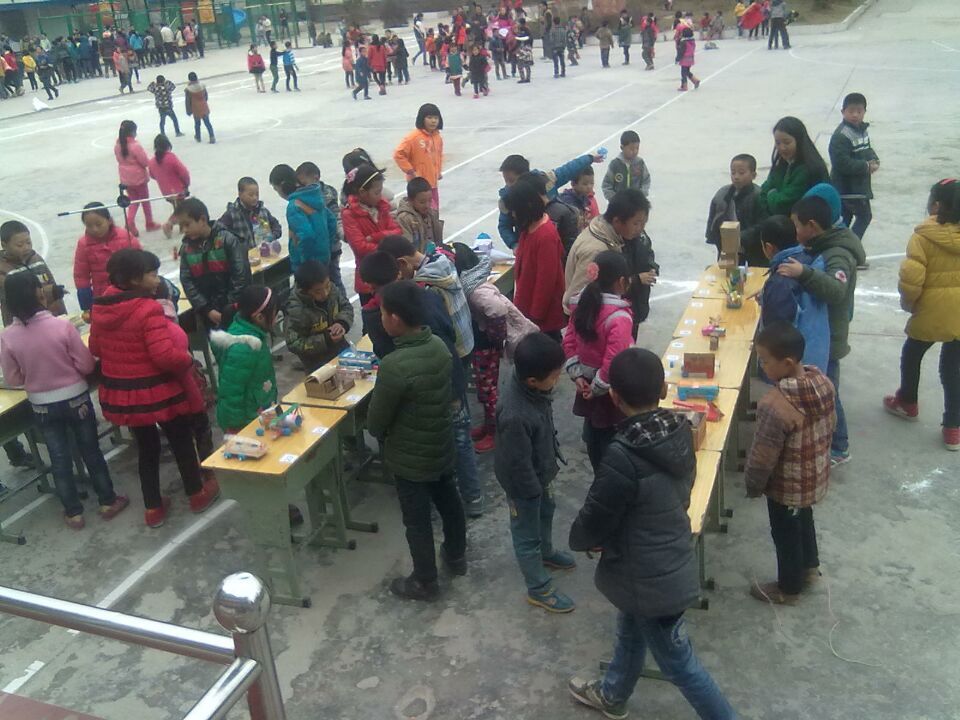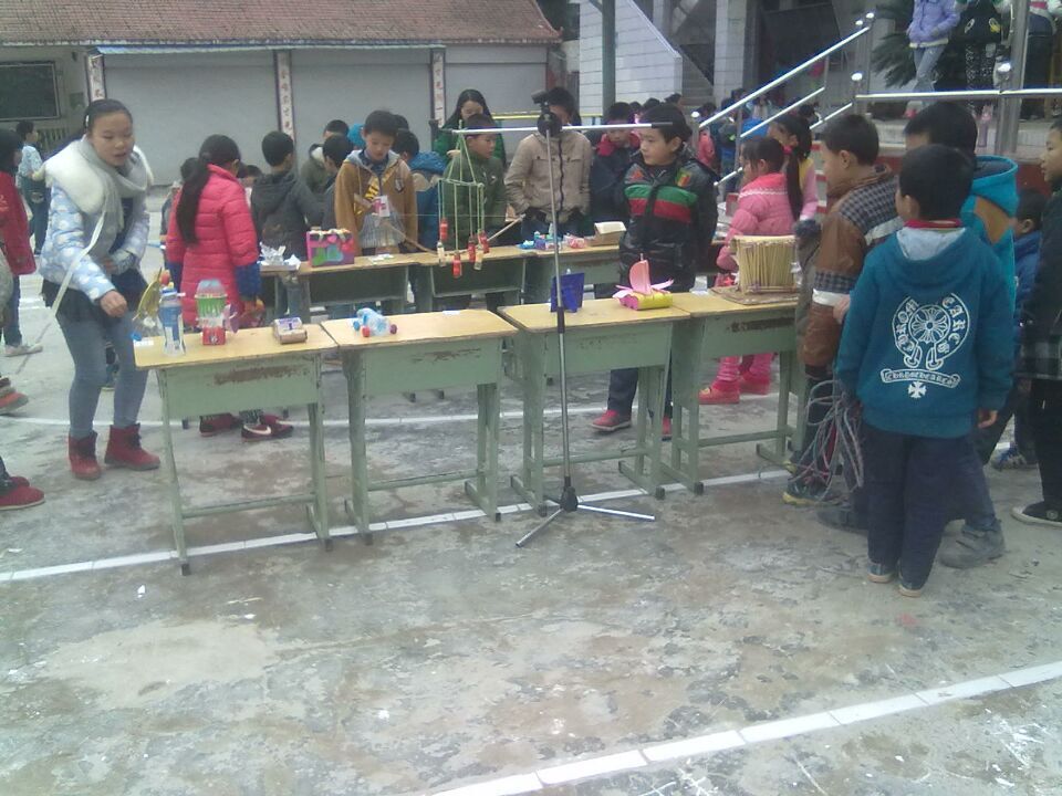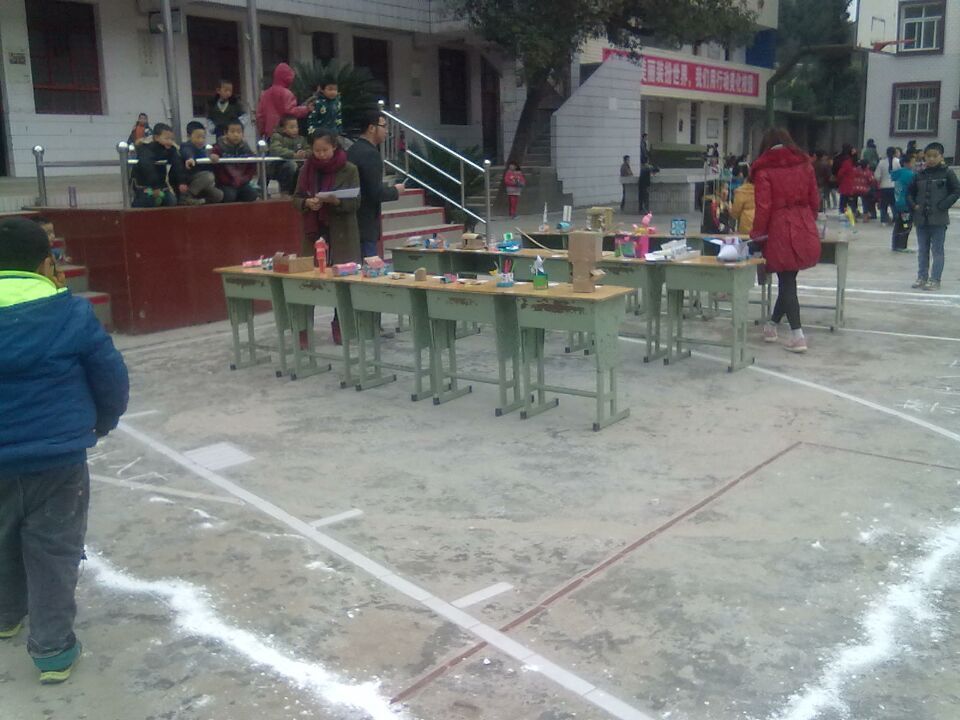 就在旗台的下方,放置着十几张桌子,上面摆放着许多不同大小,形态各异的学生作品。四周撒了石灰,就是说现在还没有开始参观,门去上观者只能站在白线以外,于是我只好耐心地等待。老师们在各个作品之间认真观察,进行初步地评价。待这些作品被老师一一审核后,在外围的我已满怀好奇,迫不及待地想在每个作品前仔细掂量。感受其他同学的创意特点。