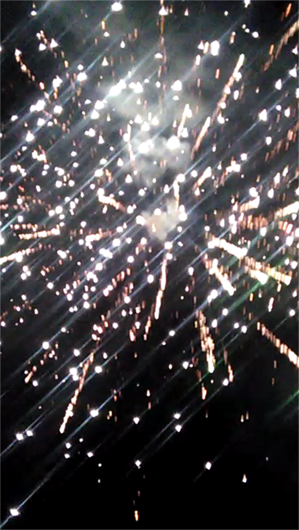 哥哥首先走到烟花的旁边,用打火机点燃了导火线,然后向一旁冲了过去,刚跑开三四米,便看见烟花一个个"嗖"的一下上了漆黑的天,”啪啪啪啪“烟花在天空中展现出自己优美的身姿,为漆黑的天空增添了”繁星点点“。我在一旁看得入了迷,姐姐用手机录了下来。大约一两分钟,烟花在空中陨落向地散来,缓缓悠悠,优雅至极。升上天空美好的烟花就像一颗颗的小星星,眼睛还眨呀眨的,仿佛输在微笑的对你说;"新年快乐!"