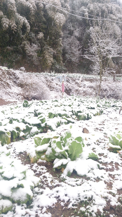 房顶上、树上、菜园里都披上了一层白色的棉被,可谓“上下一片白”。这里的雪不同于北方,北方那厚厚的雪盖住房子,大树,一眼望去,白茫茫一片,没有一丝生气。而我们这里的雪很薄,轻轻盖在菜叶上,可依稀看见菜叶的轮廓与颜色,让雪景多了几分生机与活力。