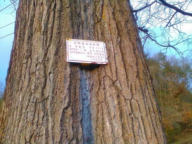 这棵树足足有十几层楼那么高,枝桠分密均匀,树形看起来很匀称,并且树上还标有一个介绍牌,为的就是希望人们去保护它,这棵树就像一个守门神,连落着村庄和村庄之间的美好风景。