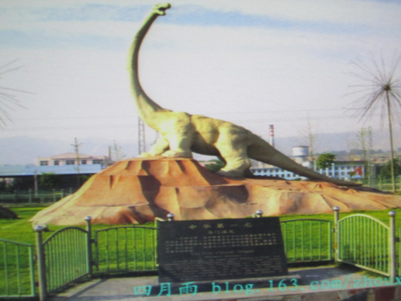 它是生活在一亿四千万年前马门溪龙的故乡。如今在华龙广场中央,有一座巨大的马门溪龙石像,这座石像可是我们海石湾最有名的,所以我们视它为宝贝非常珍惜它。