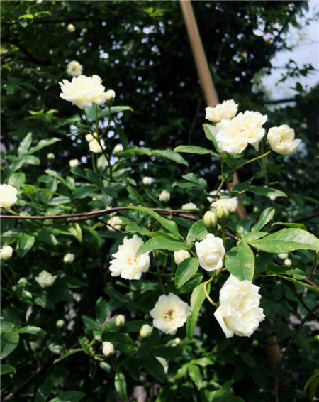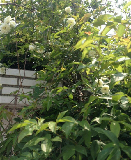 不知过了多少个春夏秋冬,他们变得茂盛了。又一季春天的来临,木蔷花开了!站在公园里,一眼可以望到公园墙上垂下的木蔷花。花枝从平台上垂下来,好似一条绿色的瀑布,从半空垂了下来;又如同一朵绿色的祥云,正从大地上冉冉升起。花枝上无数白色花儿开放,如同一块绿色的草地上镶上了一朵朵白色的大花。