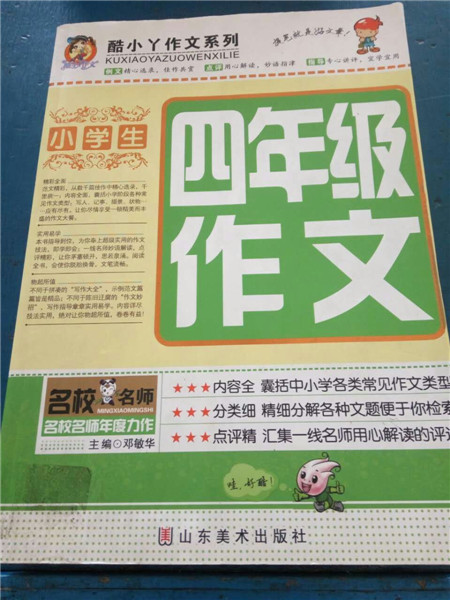 然后,我就去找了。我刚一跑,就看见了一本书。他正面的上面是白色的,中间是黄色的和绿色的,下面是白色的,黄色的中间写着五个大字,四年级作文。我一看就喜欢上了它,我让妈妈给我把它给我买了下来。回家的路上,我一直看着它——这本颜色鲜艳,知识渊博的书。