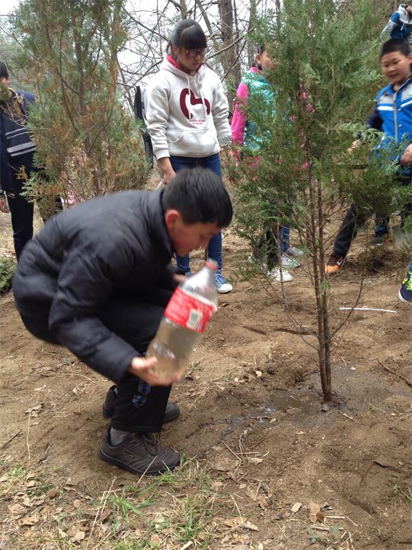 树种好了,还有一个很重要的环节,那就是浇水,男生们种树那可都是力气活,女生们当然得自告奋勇地去接水咯。几个女生排着队上去就找水源,可找了半天也没有水的踪影,正当他们失落的时候,却突然在一个水沟里发现了水源,他们便一路有说有笑的提着水回来了,拿着这来之不易的水啊,浇给这小小的树苗......脸上挂着甜甜的微笑。