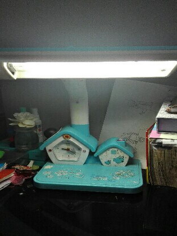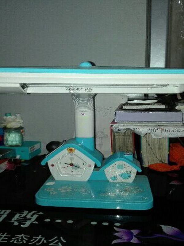 我有一盏天蓝色的台灯。台灯下有一间小房子,房子里有两只蓝色兔子,旁边还有一个很准的钟,这个台灯,有一个长长的白色的"脖子",可以任意调整灯光的高度,灯光也很亮,整个台灯看起来非常漂亮。