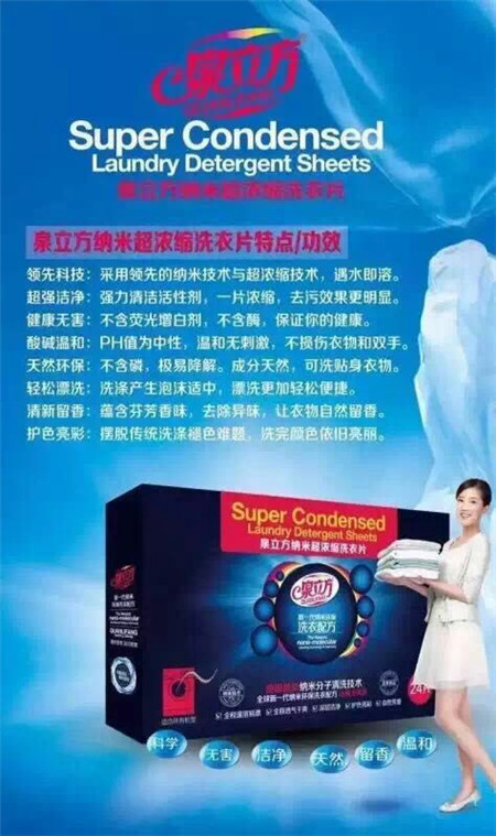 泉立方开启健康洗衣新时代,采用了德国纳米清洗技术。泉立方纳米超浓缩洗衣片占十大优势1:无害无毒、母婴放心用。2:体积小巧,便存易携3:PH中性,不伤皮肤、衣物4:除菌抑螨、强力洁净5:溶解迅速、极易漂洗6:天然配方、绿色环保7;迷人香型,持久留香8:洁净、消毒、柔顺、护色9:节能高,经济实惠10:无磷、更健康 我来说说荧光增白剂的危害:大大消减人体免疫力损伤血液系统,其毒性积累在肝脏或其他重要器官,引起癌变。通过内衣接触女性私处会诱发细菌、霉菌,健康皮肤长期接触附着荧火剂的衣服可能导致过敏、湿疹等皮肤疾病。
