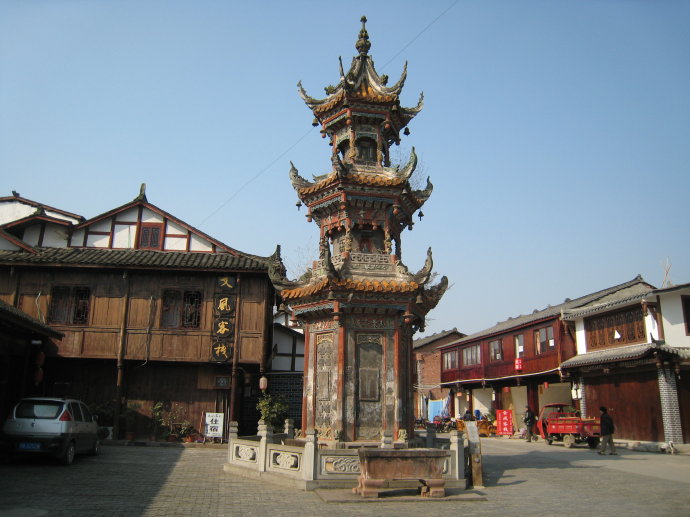 走进古镇,第一个看见的就是一座六角形的古塔,那就是文风塔,它分四层,每一层都有壁画,六个角上都挂着风铃。前来游玩的人都会驻足观看,摄影留念,不少人还会在底层的“惜字宫”里烧香膜拜,十分虔诚。