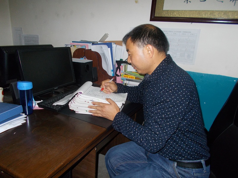 汤老师很关心我们的学习,我们遇到难题边去请教他,他也会耐心的给我们讲解,对待我们的作业,他总是一丝不苟的批改,看,他紧锁眉头,手中的笔不停地动着,改完一本又一本,直到深夜。