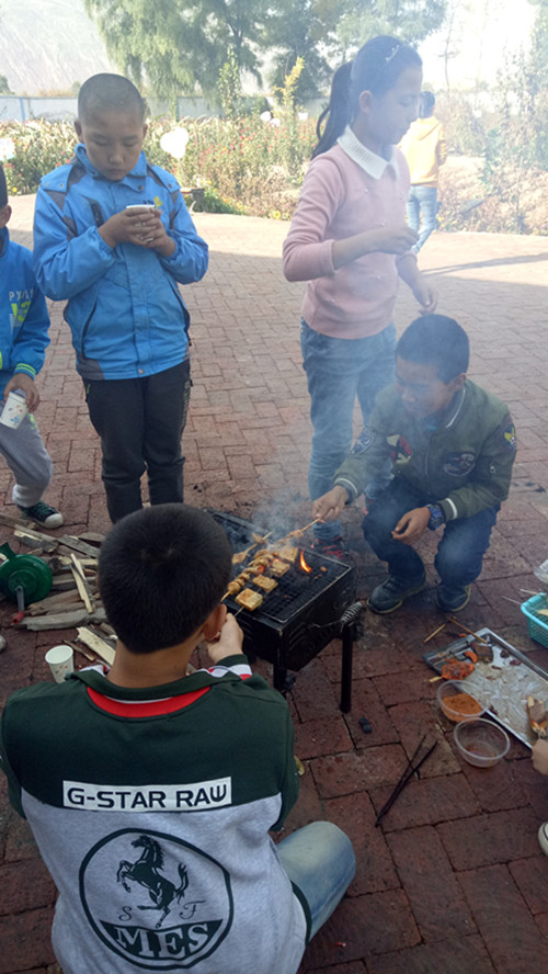 老师给我们分了小组让我们去太烧烤炉,老师找来柴,我们分好队,分好食物,我们去洗菜,洗完菜去切洋芋,然后用签子穿起来,正好我们不会生炉子,这位校车师傅说生好了先吹一会就好了,然后我们烧烤起来。