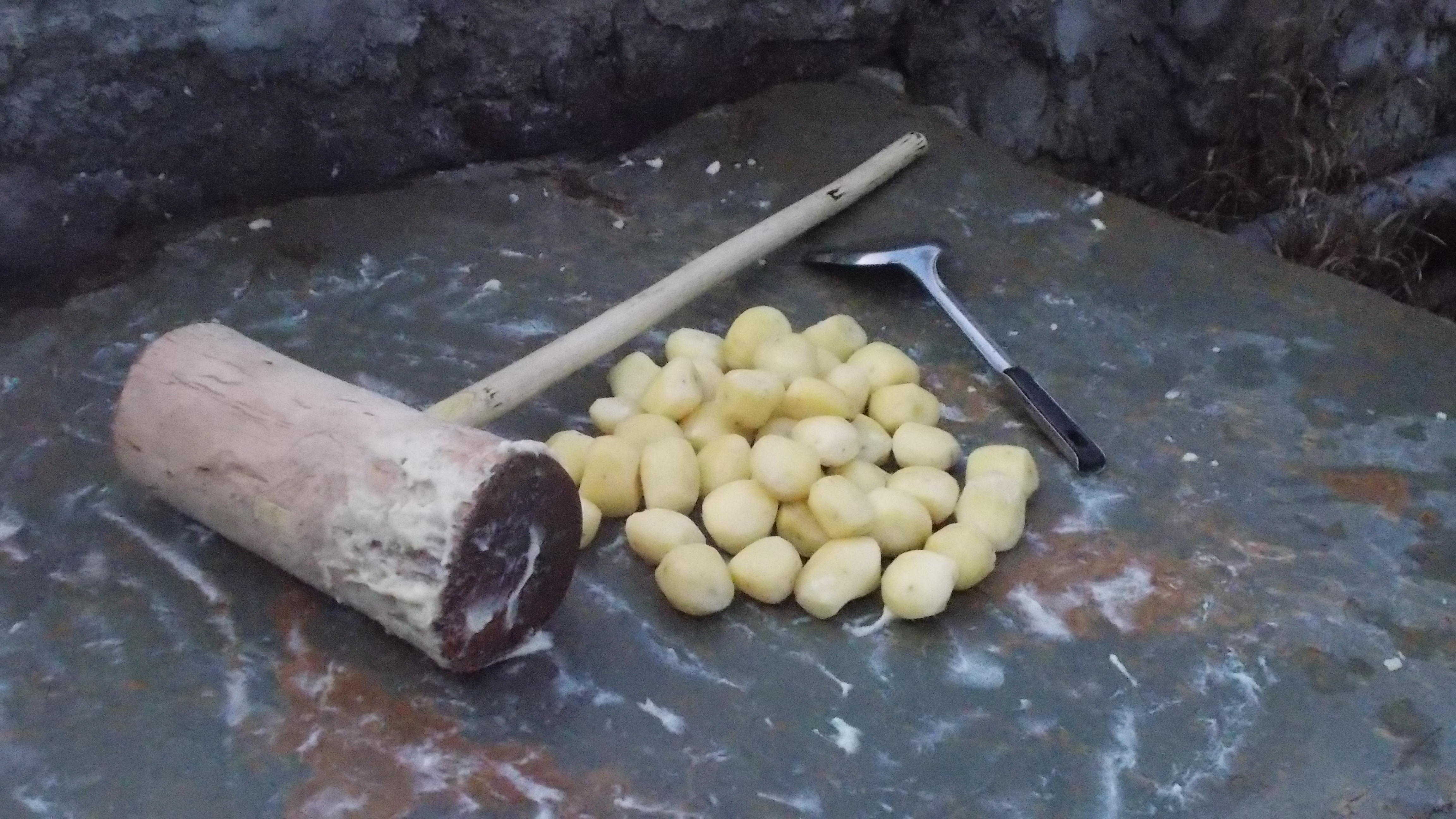 然后要用木锤反复的压挤,这途中要注意,千万不能使大劲,因为这样可能会把洋芋打到地上。只有打到快成团时,才可以使大劲。