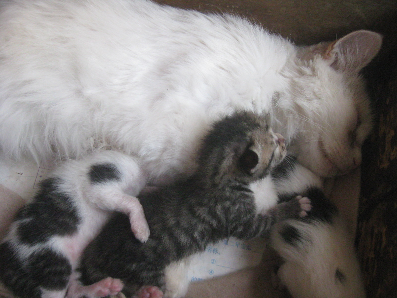 有两只小猫的鼻子是黑色的,一只是粉色的。它们的脚丫子很柔软,有两只是白色的,一只是黑色的。它们的母亲很瘦很瘦,却对自己的孩子很好,每天给它们洗澡,喂食。做为一个母亲,做这些也是理所当然的。为了保护自己的孩子,它也会奋力与入侵者搏斗。我祝福小猫,快快长大,成为一个健康快乐的小猫咪。