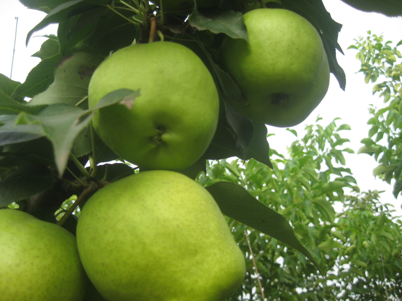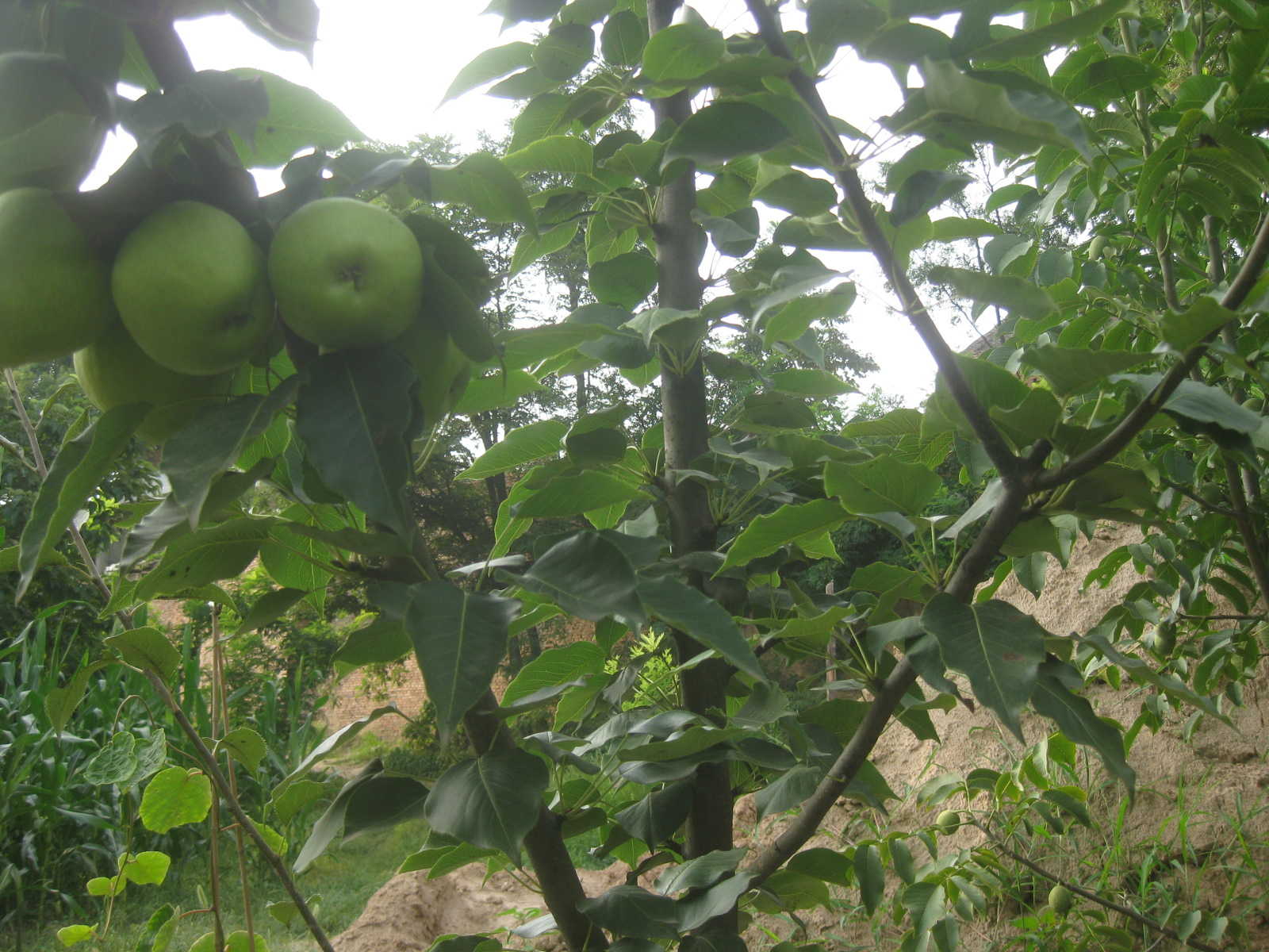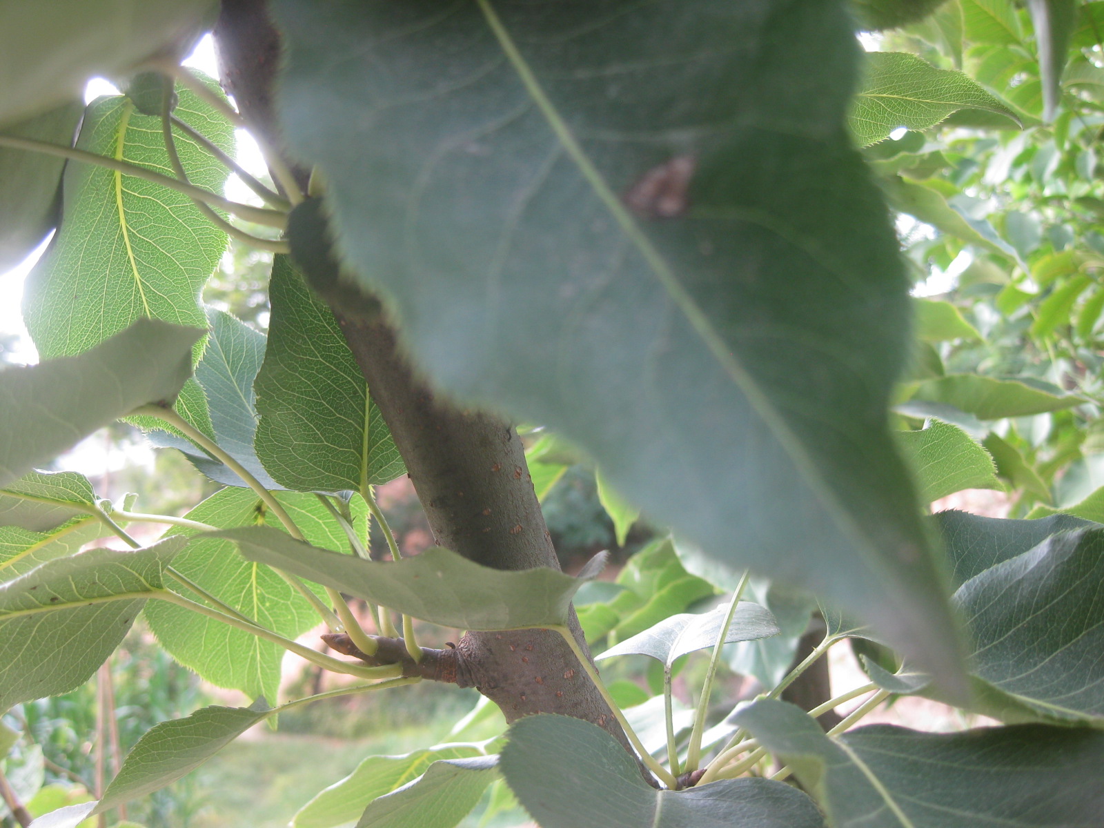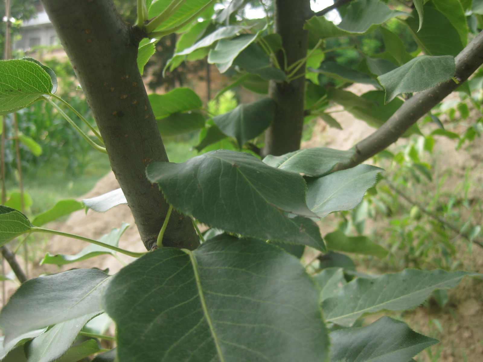 梨树属于蔷薇科梨属,多年生落叶果树,乔木,在许多地方都有所分布。它的主要品种有秋子梨,白梨,沙梨,洋梨四种。看这棵梨树,它并未长大,仅1—2米高,叶片上较粗糙,边缘呈锯齿型。看,这儿有几个梨聚在一起玩耍,打闹呢!虽然现在是绿色的,但是一想要不了多久就可以吃到梨,就让人迫不及待呢!