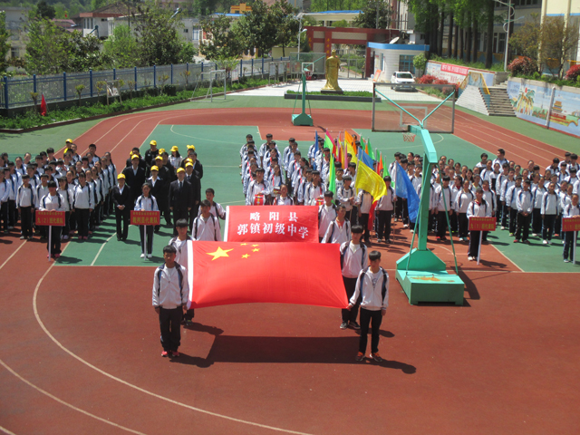 踏着整齐的步伐,我们走向了主席台,主持人镇重的说:"郭镇初级中学第三届运动会正式开始。"在锣鼓声声中,在一个个响亮而又气势磅礴的口号下,运动会正式开幕。 走在最前面的是护旗手,他们踏着整齐的步伐,雄赳赳,气昂昂的走过主席台。接下来是锣鼓队,他们敲着鼓,吹着号,奏出一段有一段精彩的乐章。跟在后面的是裁判员代表队,他们定会公平公正的监督比赛,评出第一第二。接着就是我们七,八,九三个年级的同学,他们朝气蓬勃,慷慨激昂。喊出了自己具有独特风格的口号,气冲斗牛,气震山河。