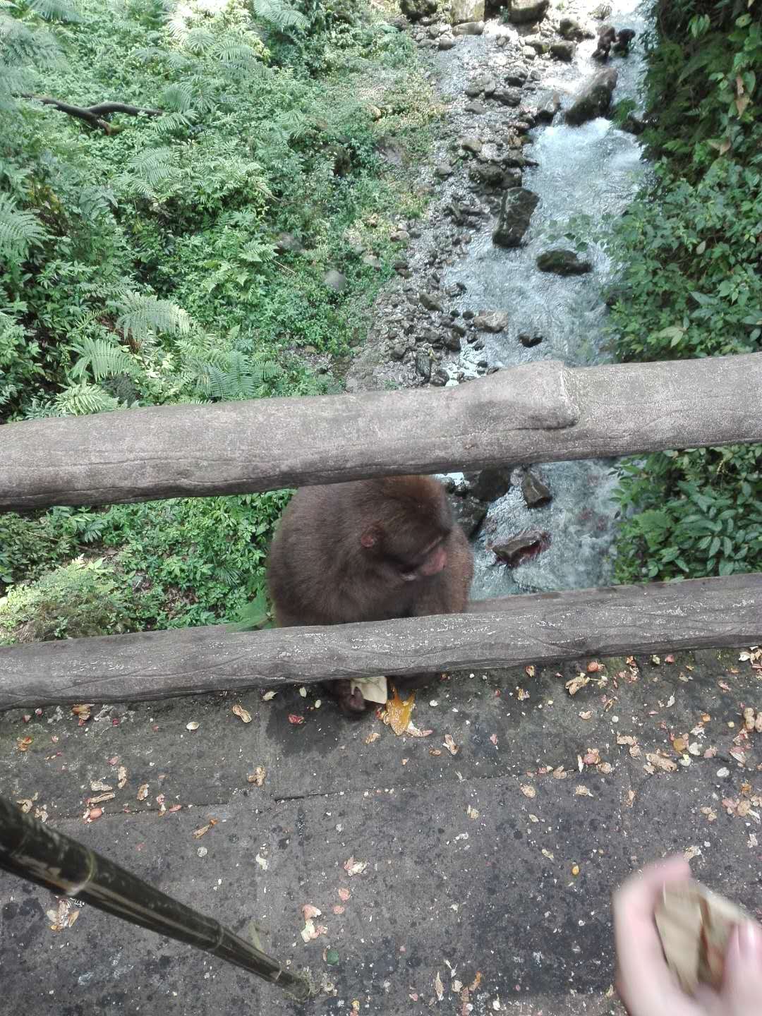 休息了一会儿,我们继续去看猴子,有一只猴子在小桥上要吃的,我便将猴粮撕开,放在手上,那只小猴子就轻轻的拿起来放在嘴里。过了一会儿,我看见了一只很大的猴子,应该是这里的猴王,它十分凶悍,大胆的冲向人群,并抢走了一位游客的苹果,还差点把一些游客的手机弄到小溪里。