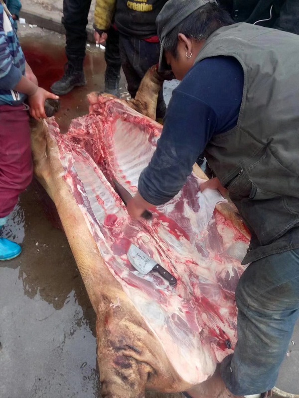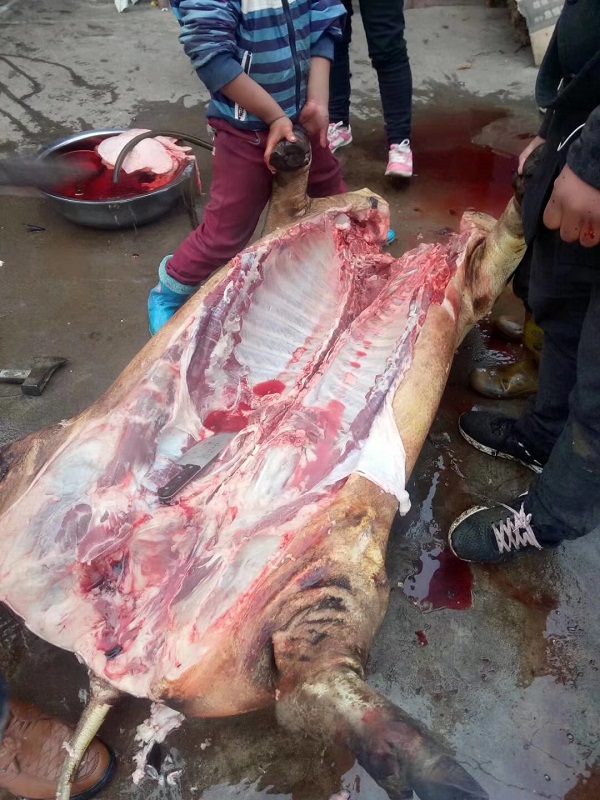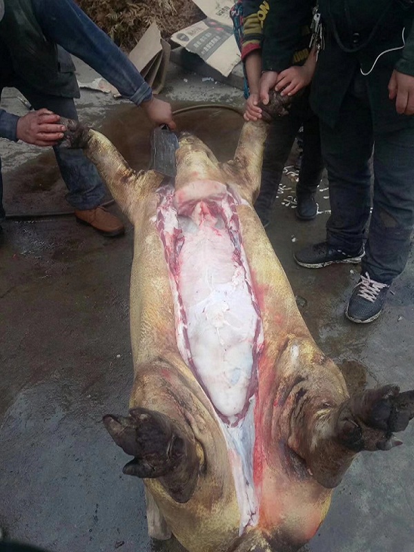随后,杀猪师傅举起刀一砍一砍地,把整条猪很快劈成了两半,剔出了猪的脊骨,很轻松地把骨和肉分开了,并将猪肉扔进另一个大盆里,还把四条猪腿也剁了下来。不到两个时辰,一头近三百多斤重的大肥猪就全部被屠宰完毕。