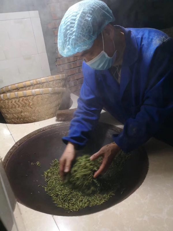 要想制成雀舌茶,下午还要去一趟茶叶加工厂。吃过午饭,爷爷开着他的小三轮,把前些天摘的茶一起拿了去。到了茶叶加工厂,才知制茶的步骤:炒青、揉茶、烘茶。瞧,先把摘好的茶芽倒进一个大锅里,加大火炒;炒好后再放在一个几案上开始揉茶;揉到一定的颜色后,再放进一个烤炉里烘烤,烘烤好后再晾冷进行包装保存。这一批茶就可以泡来饮用了。