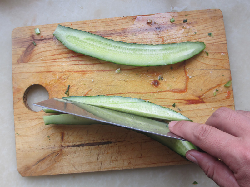于是,我信心百倍的来到厨房,从拿出一个身上长满刺的碧绿的黄瓜,我把它洗的干干净净的,这时就得用菜板大哥帮忙了,我把它放在菜板大哥身上再用刀小弟拍黄瓜,我用劲拍,那黄瓜里的果就像一个个淘气的小娃娃,我拍一下,他就跑一个。不一会儿就拍完了,我一看呀!黄瓜就剩一点了,我心想,一点就一点吧!我拿起醋小弟一不小心把半瓶醋都倒了进去,这时妈妈回来了。妈妈看了说:“做拍黄瓜呢,快给妈妈尝一尝。”我听了递给了妈妈,妈妈吃了一口差点把牙酸掉,这时妈妈才认真的学做拍黄瓜。