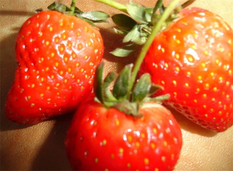 草莓有的是圆形的,有的是球形的,成熟的草莓红艳艳的,放进嘴里,一咬,那鲜嫩的果肉好吃极了。那酸酸甜甜的汁液,嘴里有一种酸溜溜、甜滋滋的感觉。