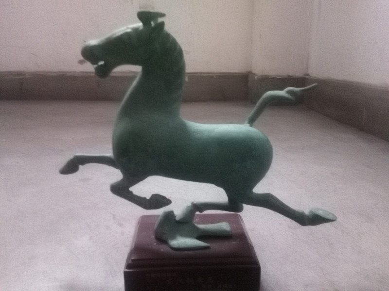 爸爸的朋友给他送了一件工艺品——铜奔马。据说铜奔马出土于武威地区,是东汉时期的青铜陪葬品。这件铜奔马整体上为一匹腾空而起的骏马足踩一只飞翔的燕子,气势磅礴,暗示着死者生前飞黄腾达,铜奔马座底有四个篆书大字"马踏飞燕"。"马踏飞燕"为中空青铜器,点点斑迹与片片纹痕记录着它古老悠久的岁月。铜马前蹄飞扬,右后腿力踏着凌空翱翔的飞燕,左后腿腾起,似乎是在空中掌握平衡,尾巴上扬,有胜利者的姿态,头抬的很高似乎,桀骜不驯,嘴半张合,仿佛于世高呼自己的建业,牙雕的异常精细,每一撮毛的豪放,瞳孔的自由,整匹马的飒爽英姿表现的淋漓尽致。铜奔马面容坚毅,似乎承担着超越常人的责任。它的主人一定是身负重任,性格豪迈,忠贞坚强,英勇无畏的将军。"马踏飞燕"如此完美,充分展示了中华民族的勤劳和智慧,凝结了劳动人民汗水、坚辛和苦涩。我想,工业代和现代化高度发达的当今社会,铸造出如此完美的工艺品谈何容易。这足以反映出东汉的繁荣昌盛,国富民强。铜奔马在东汉人民的双手中完美呈现,锻造的不是铜,是东汉人民无穷的智慧,充满着一个民族坚毅、自信、向上和无畏的精神和创造璀璨文化以及辉煌文明的力量。"马踏飞燕"是我国古代人民智慧的结晶,华夏民族繁荣昌盛的精神之本,它不断激历着华夏儿女创造新的业绩、新的辉煌,使中华民族屹立在世界之林,繁荣昌盛。