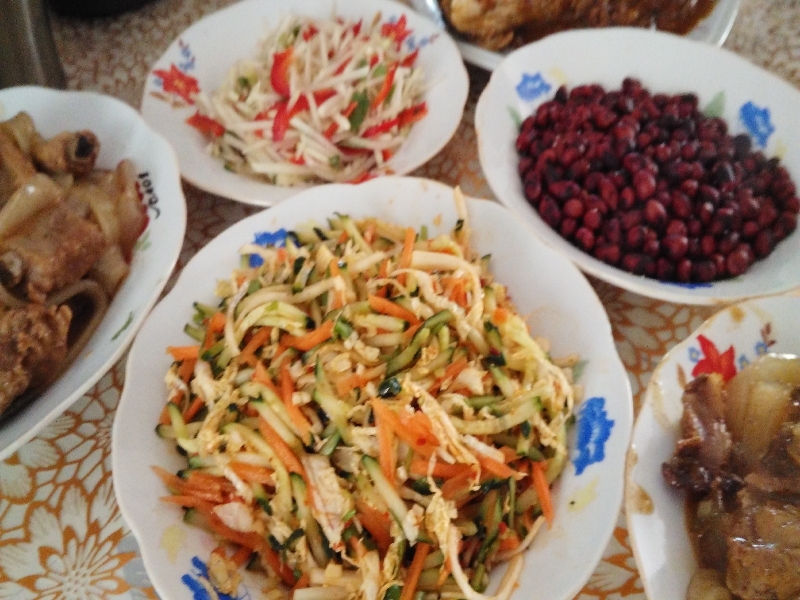 交响乐于除夕这天晚上八点准时在鞭炮声中奏响。随着米饭的上桌,东北炖菜拉开了独奏的序幕。东北炖菜并不像川菜有一招一式,不像粤菜陷于一种模式,也不像鲁菜有其定量,更不像沪菜那么死板。东北炖菜的独特之处在于没有规定其样式、材料。在特大号的锅中炖荤煮素,味道更是百变,如炖山茹小鸡是一味、炖猪肉酸菜是一味、炖豆腐是一味、炖脱水芋粉条又是一味。在炖的过程中加入血肠、泡椒、老姜,既能使菜鲜美,又能让人面对严冬不再寒冷。而大锅炖菜需用干柴烧,说是能荤素入味,但我而言,仅仅被熏得龇牙咧嘴,泪流满面了。年糕协奏的加入使曲子愈见欢快。白年糕、黄年糕,香气扑鼻;加红豆、加云豆,锦上添花。从腊月初八做准备,只为这天的交响曲。古稀老人们并没有因牙口不好咬不动年糕而年迈伤感,而是像孩一样笑得合不拢口。