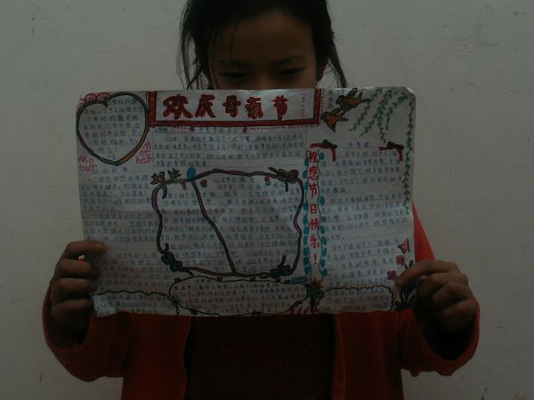 接着上场的是小玩子,这个疯丫头呀,天天就知道玩,今天她会送什么礼物呢?真是令人期待。看,她手里拿着的是啥呀?好象是一份手抄报,质量挺不错的哟!她也有耐心和兴趣来做这个?不会是克隆的吧!也许我的这份礼物不算什么,但是我知道,只要是我用心作的东西,不管他有多坏,父母也会喜欢的,这份手抄报是我对父母的爱的体现,我想它代表的含义大家也都明白,那就是我会努力改掉贪玩的毛病,在家里帮助父母做些力所能及的事,好好搞好自己的学习---------请同学门帮助我,谢谢!加油干吧!我们会支持你的!我们叫嚷道