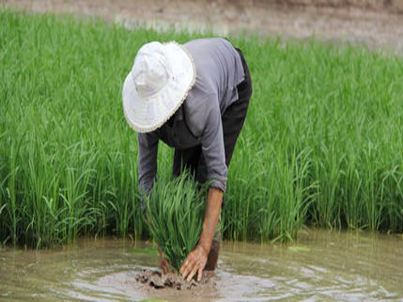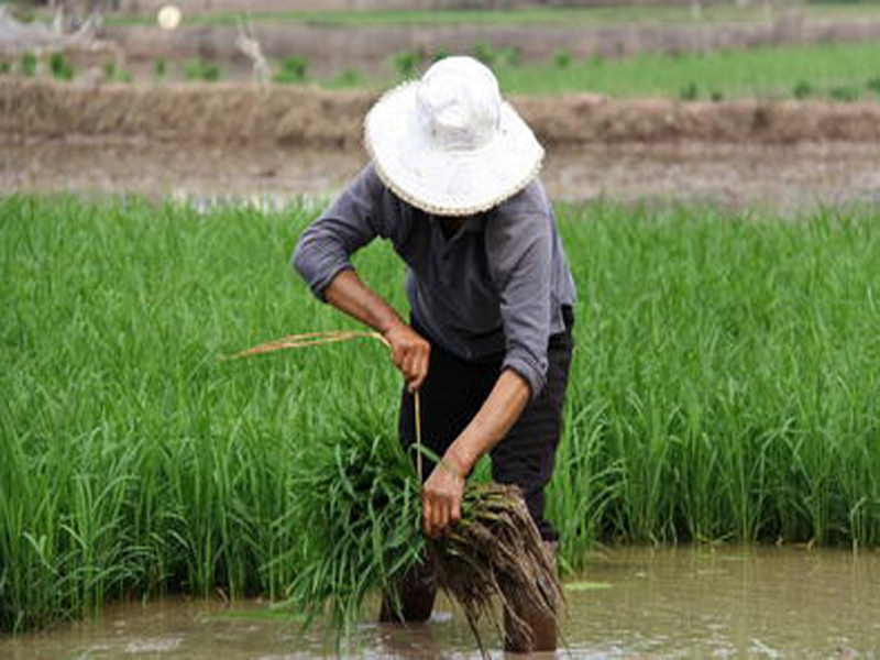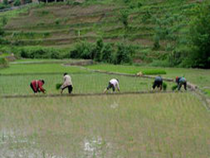 才婆婆让我穿上胶鞋下水,我穿了胶鞋,觉得不爽,太吃力了,鞋出不来,于是就干脆赤脚。我顺着栽秧线,在线旁边插秧,左手拿着秧苗,用右手的食指和中指夹着插入泥土中,一棵棵秧苗插进去,回头一看,一下往东倒,一下往西倒。在婆婆提示下,努力改正插秧方法,终于顺手了许多。