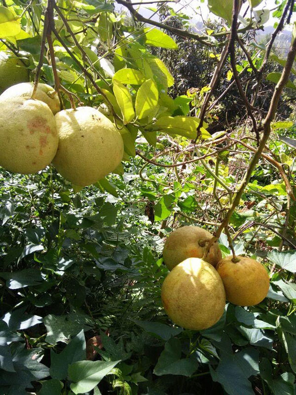 在阳光布满的果园里,随着太阳的照射,一树树的柚子压着枝头都压到了地上,也象征着这是一个丰收的季节吧。