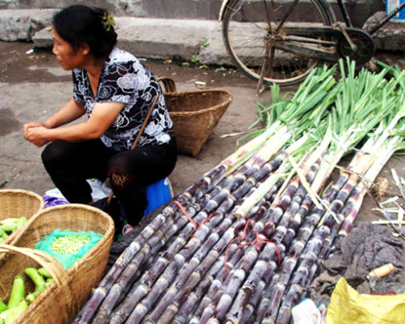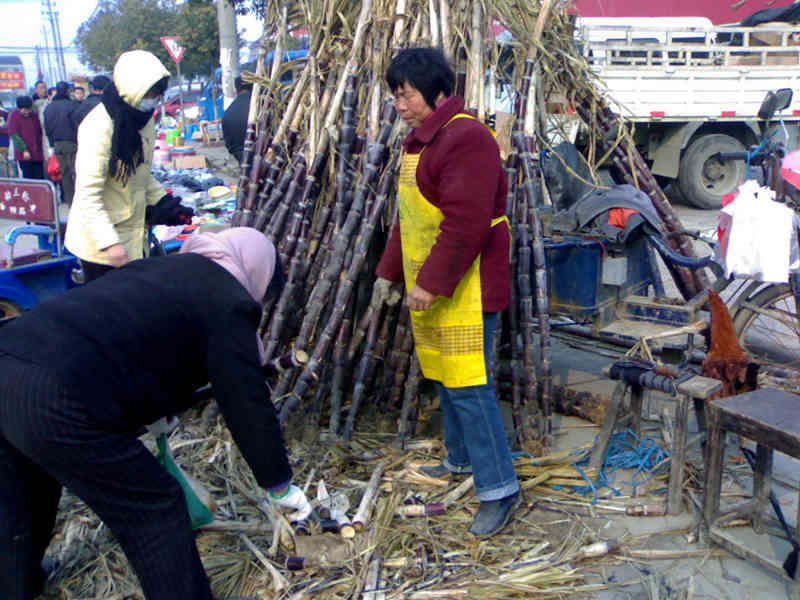 在街上我们就这样东看看西看看地慢慢逛着,突然妹妹拉着我的衣服并将另外一只手指向前面喊道:"姐,甘蔗,我要吃甘蔗"。我们顺着妹妹指的方向望去,原来街对面在卖甘蔗,甘蔗紫里透亮,个头粗大,看着确实挺不错。看着妹妹这央求的眼神,并且看她已经奔向了卖甘蔗的地方,我决定还是给妹妹买一根吧。就一起也向卖甘蔗的地方走去。