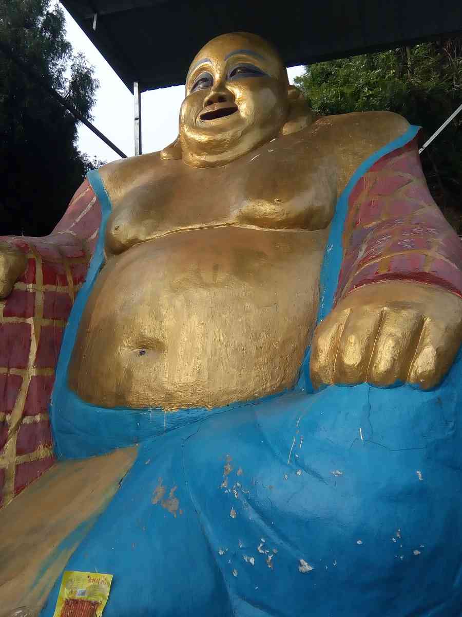 早已听说花丛南岳山是远近闻名的灵山佛地,在这个端午假期,既然我们没有机会拜谒爱国诗人屈原的故里,便带着一颗虔诚的心去寻访这里的名胜吧。从山脚拾级而上,爬到两百余级的山腰,便看到一座金身是佛,披着红色袈裟,穿着绿袍,腆着容纳天下的大肚子,神态安详自若,平视远方,洞察芸芸众生,俯察苍生万物。见其伟岸的身躯,我们不知道是如来佛还是笑佛或其他神仙,慌忙拱手作揖跪拜,默默祈祷,保佑终生平安、成绩高升!因为外祖母告诫过我:心中有佛,心诚则灵!