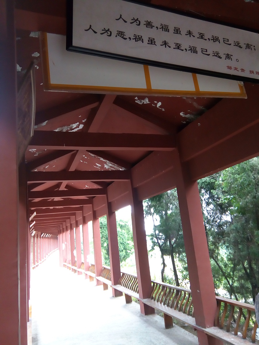 我们转过几个坡坎,又来到一凉亭,绵延望不到头,都是人工精心打造,见两边有座椅,我们就此坐下休息。亭上方依次挂满一排当地人捐赠的名言匾额,都是些警世恒言,你看:人为善,福虽未至,祸已远离;人为恶,祸虽未至,福已远离。说得多有道理!句句都会警醒尘世间的众人,行善积德,远离凶恶贪恋,做一个心灵澄澈的人!当我们慢慢下山的时候,已是烈日当顶,山下一片燥热和热闹。