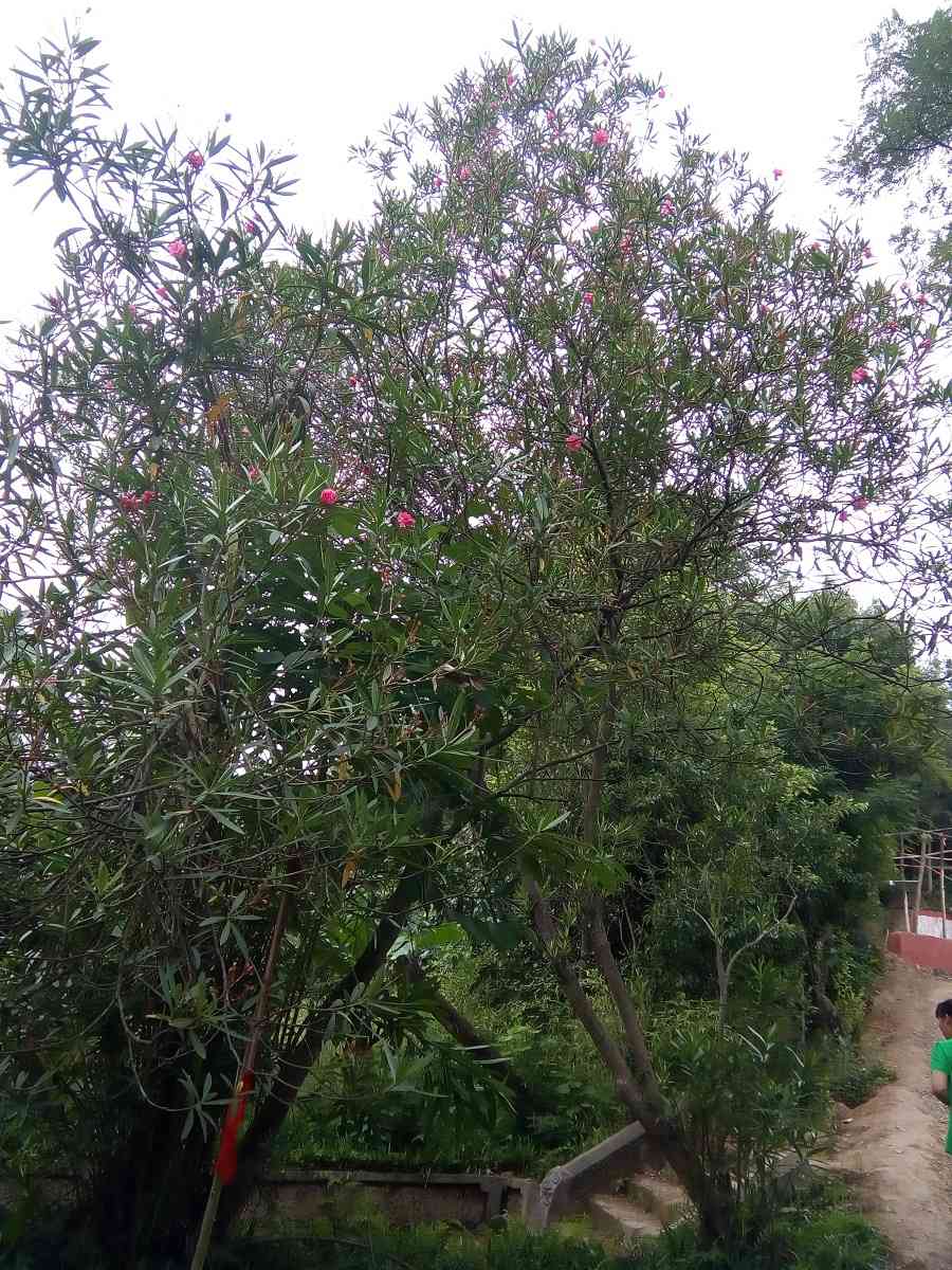 我们爬至山顶,已是大汗淋漓,气喘吁吁,人间六月,山下早已酷热难当,山上绿树成荫,遮天蔽日,清幽凉爽。绕过几经周折的羊肠小路,便看到绿树掩映的一寺庙,庙前有不知名的缀有红花的树林,那些花儿在这万绿丛中格外耀眼。