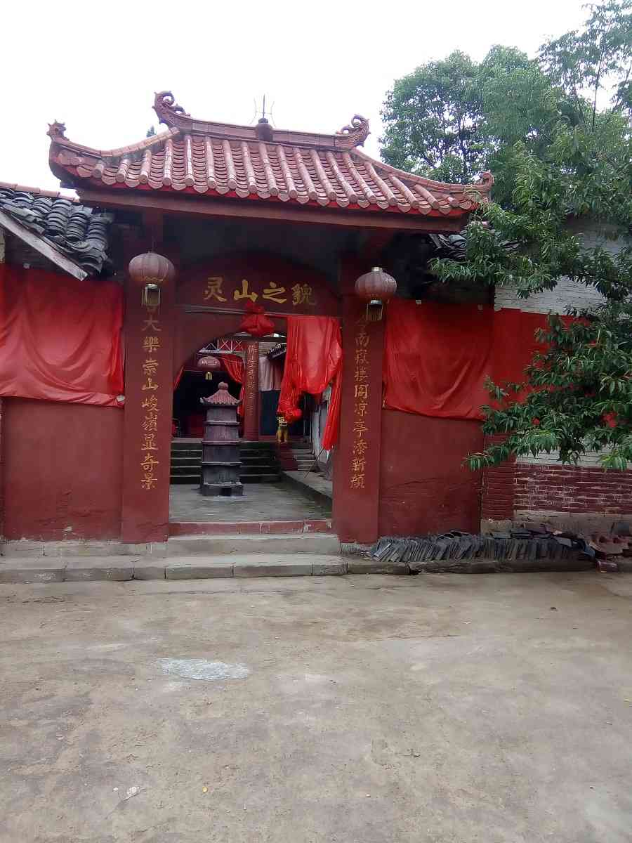 接着便见到一座红墙红瓦,挂满红绸的寺庙,曰“灵山寺”,大门左右刻着一副烫金对联,我是一个喜欢碑刻书法的孩子,只见写着:古大乐崇山峻岭显奇景,今南岳楼阁凉亭添新颜。庙前几棵李子树,上面果实累累,明显还没成熟,不能采摘。这真是“曲径通幽处,禅房花木深”,庙里菩萨列座,香火缭绕,钟磬悠悠,好一派佛地胜景!我们一一细看了一遍,又烧香作揖,休息了一会儿,才依依离去。