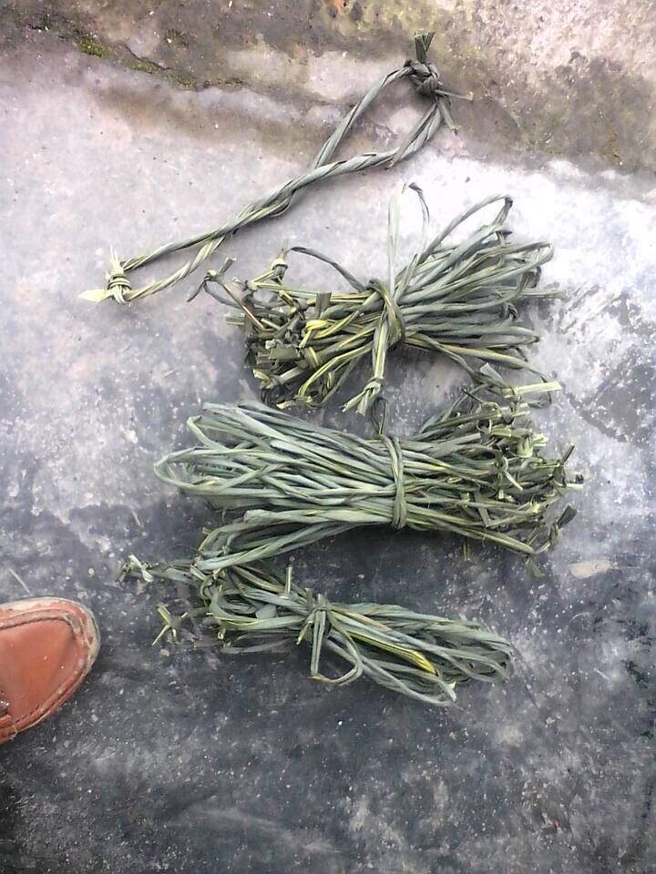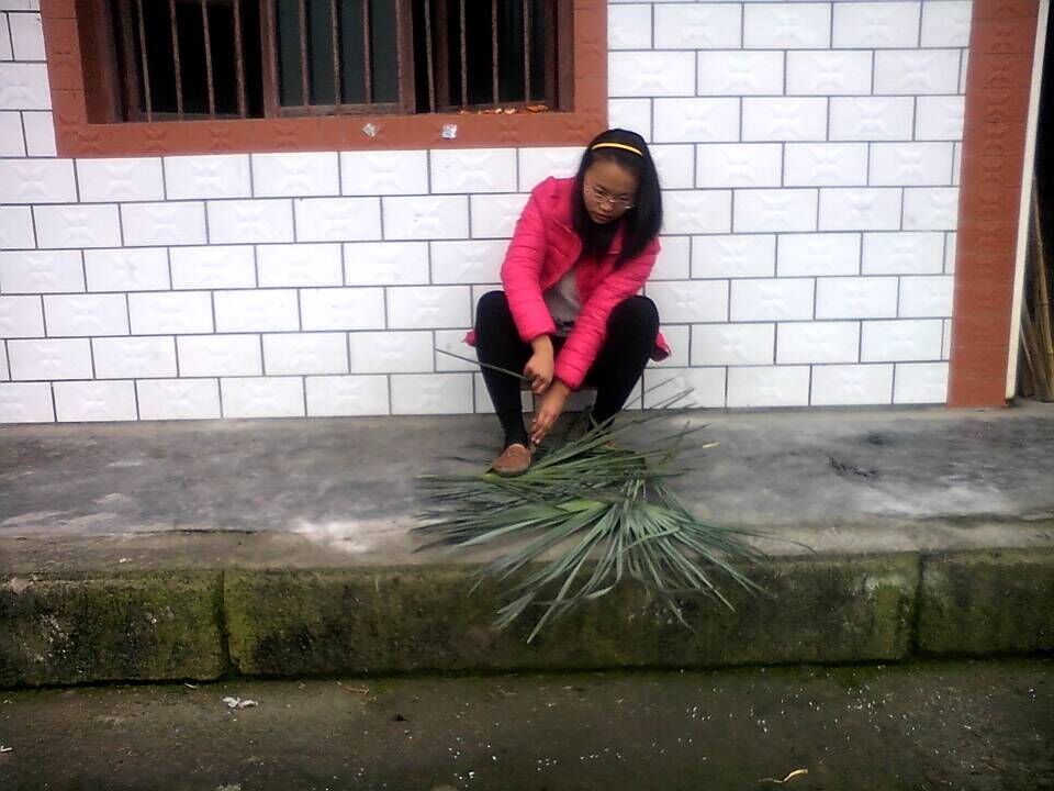 一出门就会看到不远的山坡上生长着几根粽架子树。这棕架子长着长长的叶子,远远看去就像一把把绿色的扇子倒插在树上。系猪肉的棕架子必须是长得比较粗壮的,越粗的叶子就越能承重。我找了几株长得较粗的“扇子”用镰刀割下来拿回家。然后选用“扇子”中的最长的那几根叶子,我把叶子的一头用我的嘴衔着,另一端握在两手中间把叶子向同一个方向搓,就像搓绳子一样。最后把这片叶子搓成了一根绳子,再把两头栓起来,打个结就大功告成了。照这样的法子我搓了很多个,因为除了系猪外,香肠啊、猪肝啊、大肠等离了它真是不行啊!