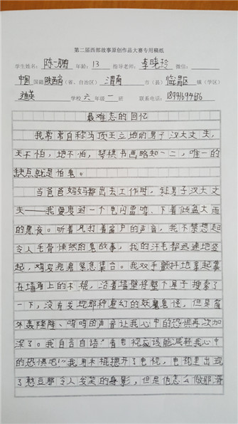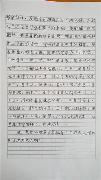 听着风打着窗户的声音,我不禁想起令人毛骨悚然的鬼故事,我的汗毛都迅速的竖起,鸡皮疙瘩紧急集合。我双手颤抖的拿起靠在墙角上的木棍,沿着墙壁把整个屋子都搜索了一下,没有发现那种虚幻的妖魔鬼怪,但是窗外轰隆隆、呜呜的声音让我心中的恐惧再次加深了。我自言自语:"看电视应该能减轻我心中的恐惧吧!"我用木棍摁开了电视,电视里出现了憨豆那令人发笑的身影,但是他怎么做那滑稽的动作,反倒没有减轻我心中的恐惧。我的心中浮现出那张牙舞爪的鬼魅,我的腿就不住地颤抖,我带着颤抖的声音说:"睡觉应该能减轻我心中的恐惧吧!"我钻进黑乎乎的被窝,望着外面的倾盆大雨,我仍然觉得恐惧。忽然,门外传来"咚,咚,咚"的声音,我满怀恐惧地想:"人家都说的半夜鬼敲门,会不会是鬼呀?"我不由得尖叫了一声,门外传来了妈妈温柔的声音:"小男子汉,快开门,害怕了吧。"我急忙穿好衣服,跳下床,疾步走过去给妈妈开门。门开了,妈妈看着我狼狈的样子,不由得笑了。我越过去,趴在她怀里,豆大的泪珠像断了线一样流了下来。"别哭了。"我迅速收起了这悲痛欲绝的样子,严肃起来……