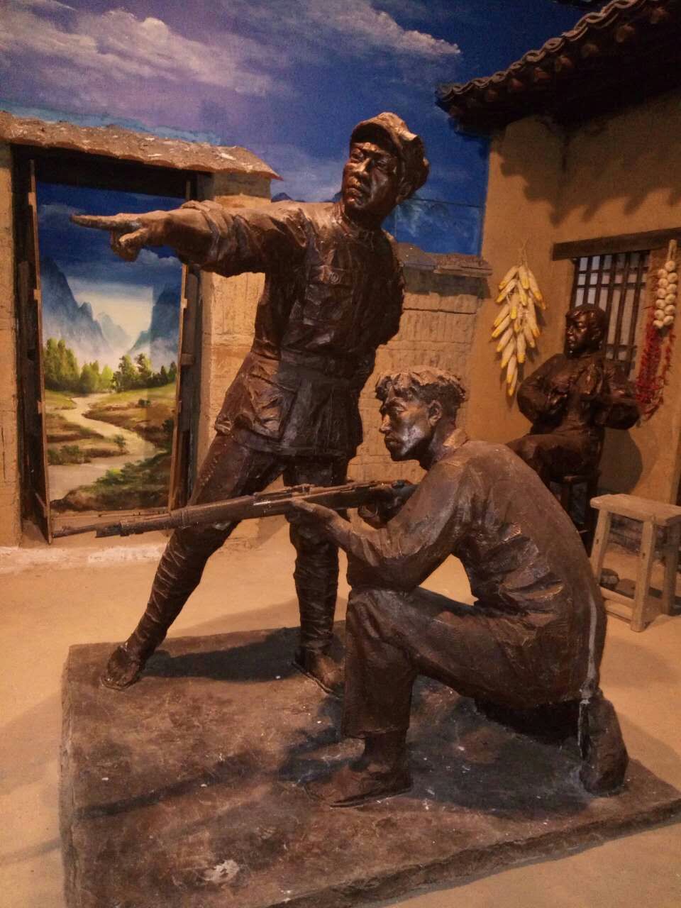 接着我们又去参观纪念馆,进去还要先登记,就可以进去啦,先来到了一楼,一楼陈列着许多各种各样的文物,还陈列着战争时期英雄的雕塑,他们雕塑得惟妙惟肖,生动地再现了当年人们的生活艰难。