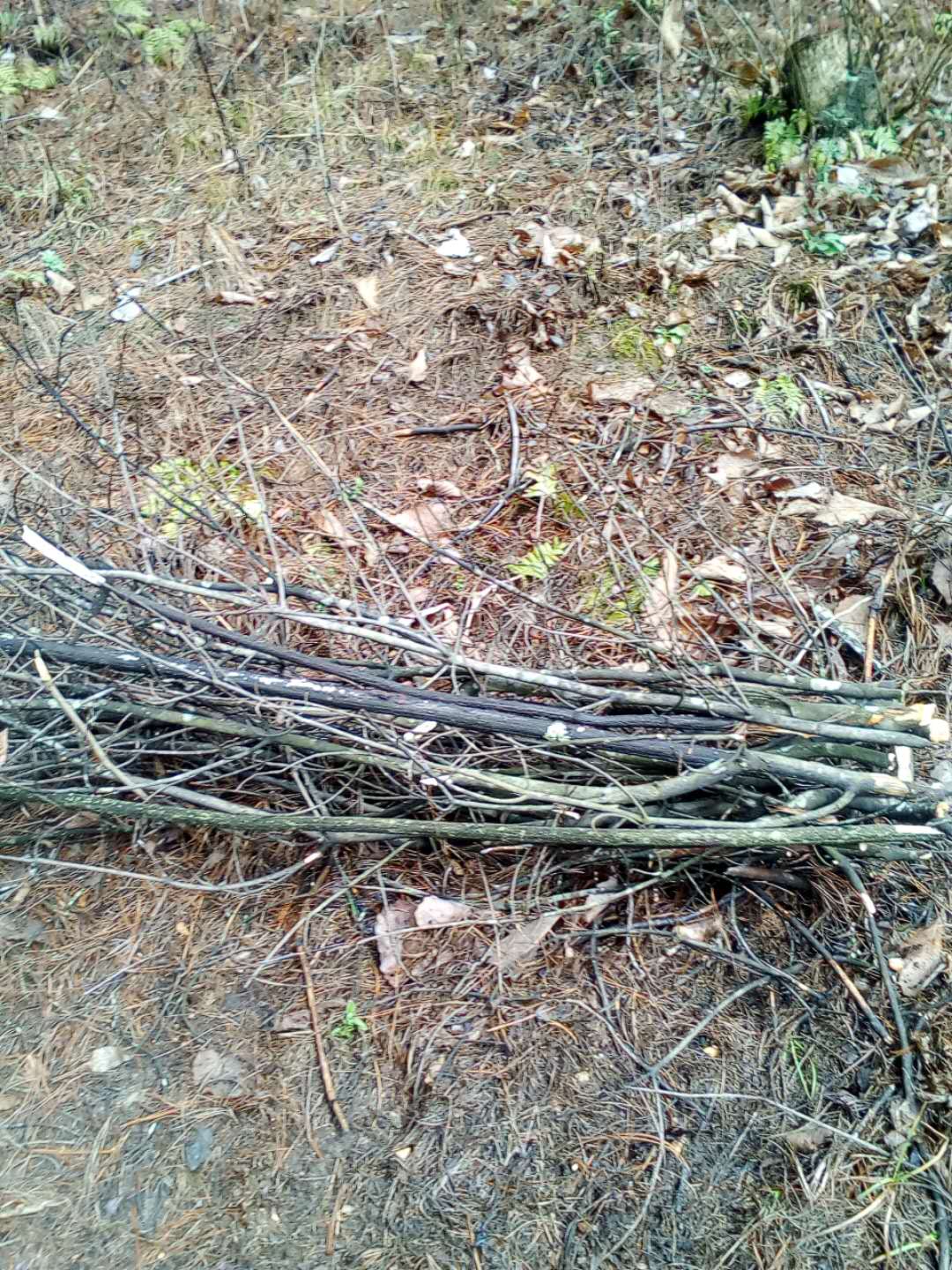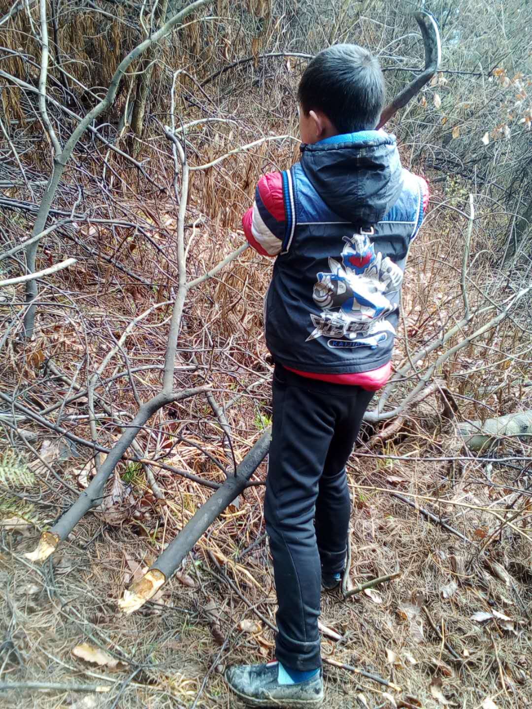 三爸首先对我说:"这次我教你背柴你可要看好了",我用力的点了点头。只见三爸先捡起许多的树枝,然后将它们根与根放在一起,再以熟练的动作一拉、一登、再一捆。就这样一捆完美的柴就被捆好了,三爸教完我后就站到我旁边看我表现。看到捆柴这么简单,我便得意的笑了笑。