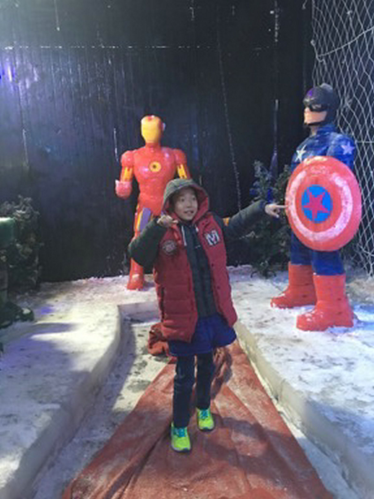 首先,映入我眼帘的是一座大型企鹅冰雕,之后发现地板都是冰做的,特别的精致。再往里面走,发现了许多冰雕,比如:天鹅、钢铁侠、变形金刚……继续向前走,发现了一座偌大的冰屋,之后玩了一个叫雪地寻宝的游戏,我找到了一个银盖子,换了五个电玩币,我非常的自豪!
