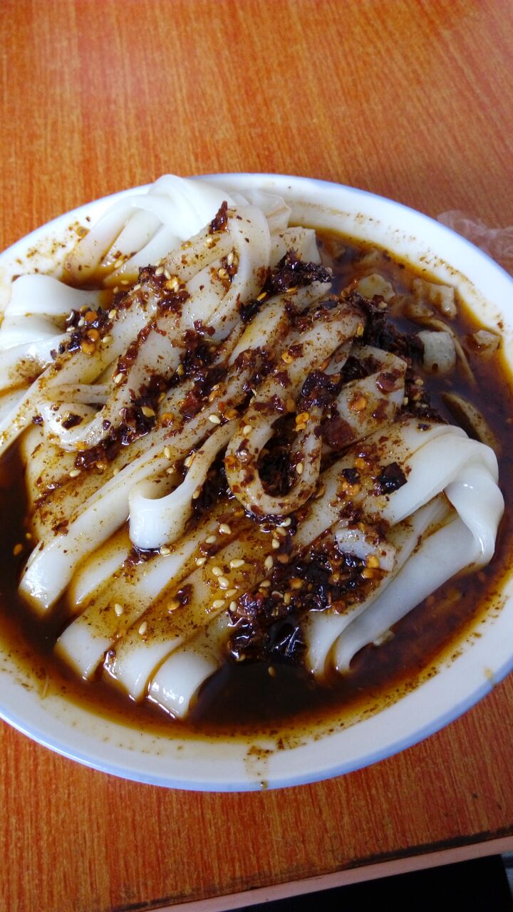 郭镇"料理",其实就是面皮配菜豆腐稀饭。面皮顾名思义,都是用面粉做的粉皮。做法非常的简单,取适当的面粉加入适当的红苕粉,然后慢慢的往装满面粉的器皿里面加水,一边加水一边用勺子在器皿里面搅。边搅边加。等面粉和水混为一体的时候就差不多了,然后我们就开始生火了。等火着了之后,往锅里加入适量的水,再把蒸笼放在锅上面,等水开了之后,我们开始了先把蒸笼上的笼布铺在上面。往笼布子上面加入适当的面浆,再把蒸笼盖好,等过了三分钟左右的时候,你可以用手揭开看一下,在这时你可要注意了,要找蒸笼上没有冒气的地方去揭,不然的话水蒸气会把你的手烫伤的,揭开蒸笼之后,看看那个面皮上面有没有起大泡,如果有的话,他就已经熟了,你要把火力赶快减小,准备往出揭面皮了,先往案板上,用油刷子刷上少量的熟油,这样的话有助于把面皮从蒸笼布子上面完整的分离下来,从蒸笼布子上面往下分离的时候,也要轻手轻脚的去操作,如果你操作的慢了的话,那么面皮就晾干了,吃起来就没有那么入味了,没有口感,因此我们分离面皮的时候动作要快一点,刷了油之后,我们就开始切面皮,切的时候可以根据个人的口味来切,有的人喜欢吃宽的,有的人喜欢吃稍微窄一点的,一般情况热面皮吃宽的比较有口感。面皮切好了之后还要往里面,放一些底垫,可以放洋芋丝,菠菜,灰灰菜,小青菜,豆芽、包包菜,放入底地垫之后,把面皮往碗里一放,加入调味品,盐、味精、蒜水、姜水、酱油、醋、辣椒等。如果可以的话,我们还可以往里面放一些炒好的青辣椒增加一点色香,这样吃起来,那简直是美妙绝伦,令人垂涎三尺,雪白的面皮,绿色的底垫,红红的辣油,青青的青椒,色香味俱全,且营养丰富,不说了,再说我口水都要流出来了。