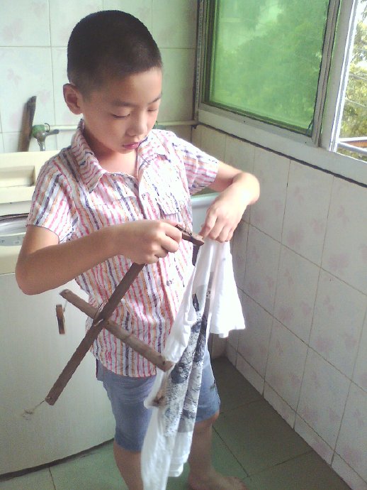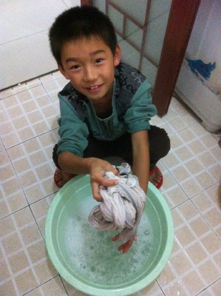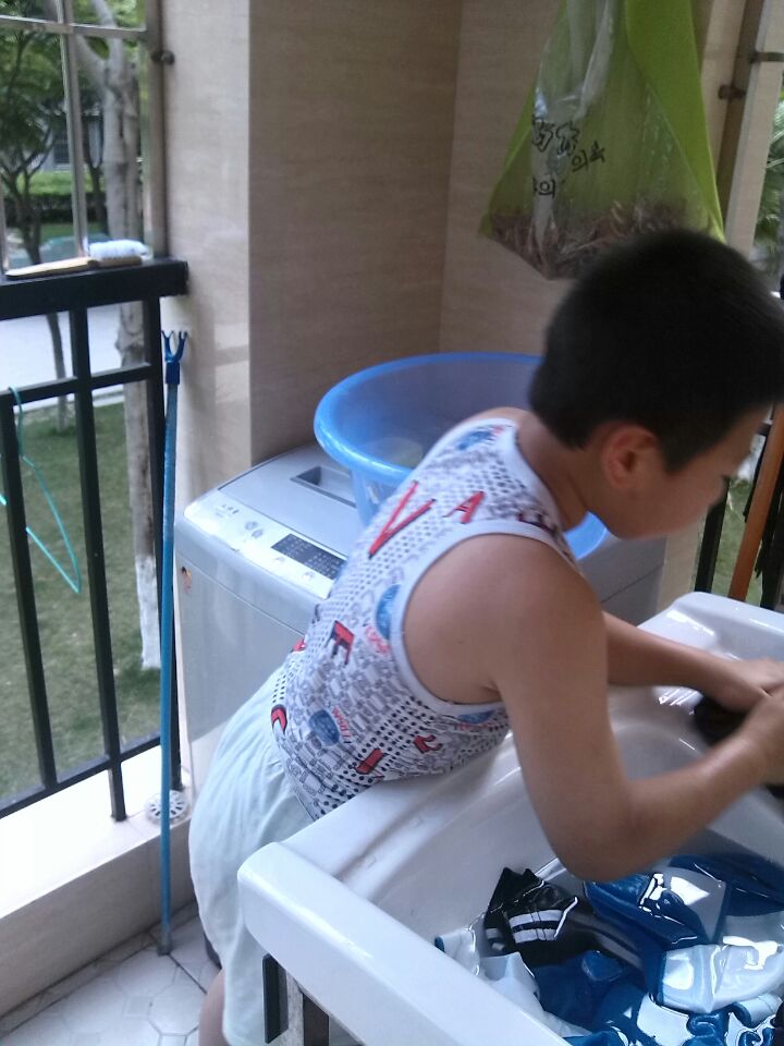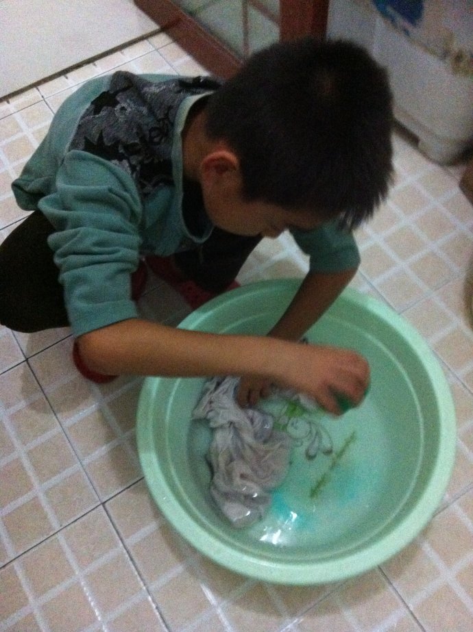 我先带上妈妈的大手套,使劲的拧开了水龙头,把盆子放在水龙头的下面,不一会盆子里就有很多的水,然后我用小勺子挖一点洗衣粉放在盆里面,顿时洗衣粉就均匀的分散到盆子的个个地方,然后我就在把脏了的衣服放在盆子里面,我就撸起袖子开始洗衣服,我先把手伸在盆子里,然后使劲搓,把衣服的每一个地方都搓一遍,我不停的来回搓了很久,看着衣服上的污渍一直洗不掉,我心里当时就想:要不不洗了吧!放在那里让妈妈回来洗,可是我转念又想:妈妈每天那么辛苦,我应该帮妈妈分担一些力所能及的事情。于是我又开始洗了一遍又一遍,再把水倒了,然后再在盆子里倒上水,在放上洗衣粉……这样洗上三四次,