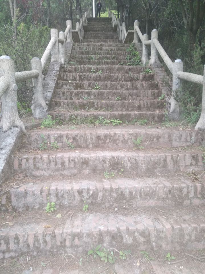 我们沿着河堤向上走,不久便来到了一座桥前,桥一边是新修的,而另一边则是原来的,据说,去年这里遭受了十年一遇的大洪水。而这座桥也是在那场洪水中毁掉的。不过,在几个月前又修好了这座桥,沿着小路来到了山脚下台阶蜿蜒而上,而旁边种着四季常青的松树, 而另一条路是人与车都可以上去的大陆。不过既然我们是来观光的,那自然要是走台阶啦!