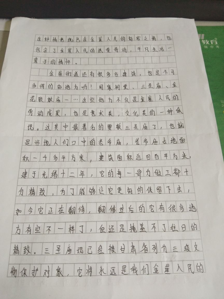 金崖街道还有很多古建筑,也是不可多得的好地方哟!周家祠堂、三圣庙、金花娘娘庙……这些地方不仅是金崖人民的劳动成果,也术艺术美,文化美的一种体现。这其中最著名的要数三圣庙了,也就是当地人们口中所称的老爷庙,老爷庙占地面积一千多平方米,建筑面积近四百平方米,建于光绪十二年,它每一部分的做工都十分精致,为了能够让它更好地保留下去,如今它正在翻修,翻修过后的它有很多地方有些不一样了,但还是掩盖不了往日的精致。三圣庙现已经北甘肃省列为三级文物保护对象,它将永远是我们金崖人民的传统文化代表。说了这么多,相信有很多朋友已经开始了解我们金崖这个地方了,它并没有你想像中的那么繁华,但它足以让你体会到一种你从未体会到的情意,这种情意包含的就多了,金崖人民的智慧情怀,金崖人民的劳动情怀,金崖人民的好客情怀,金崖人民的等等……太多了就不一一例举了,反正你来了就知道了。