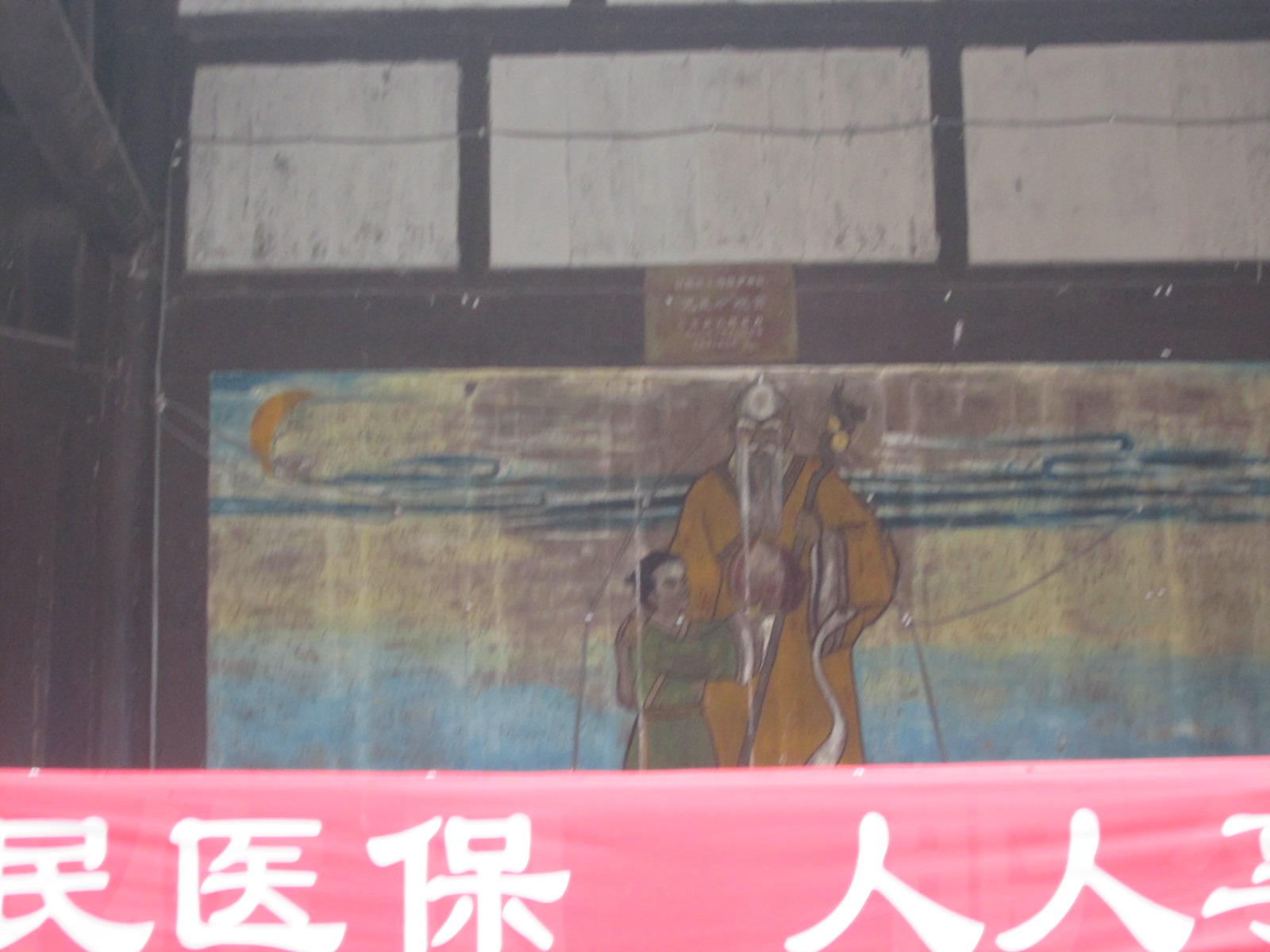 戏台不大,喝戏却是绰绰有余的了,它正面有 一幅画,画的内容大概是小儿在向老师请教问题,左右两侧也各有一幅,但已经看不请楚了。戏楼梁上还有十三幅画,我只认得《武松打虎》和《精忠报国》,其余的有些模糊,难以分辨了。整个戏楼都是古代的风格。在戏楼中央有一块扁额,写着大大的三个字:优孟才。这是戏楼的名字,说起名字的由来,从戏楼下那块石碑上可以看到,是以春秋时期楚国王宫滑稽戏曲表演大师 “优子”而命名的,可能是因为,这个人是我们四川的吧?