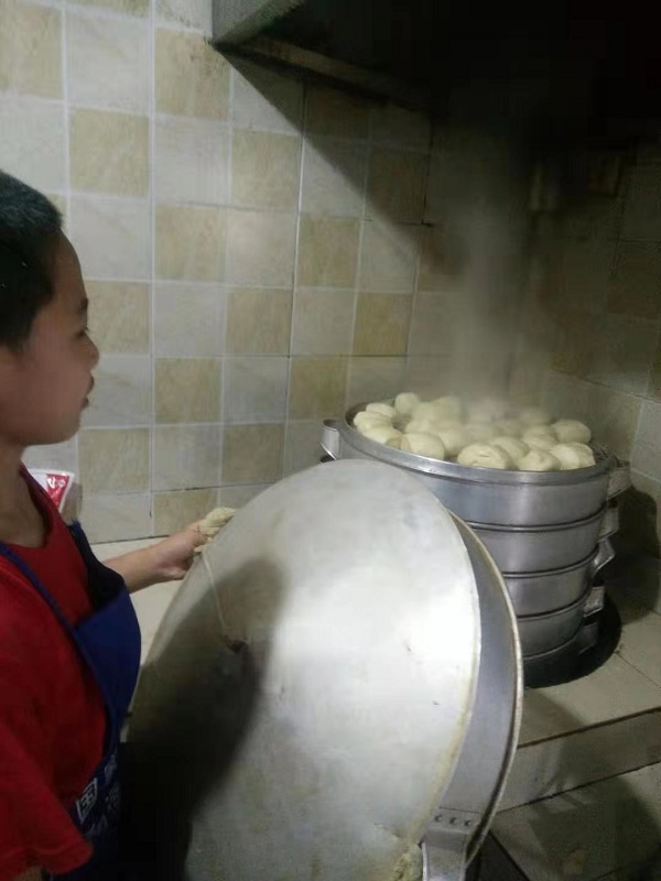 第一笼的馒头蒸好了,热气从蒸笼里扑卷而来,将热腾腾的馒头抛散倒在烧箕里散热。看着热气在空中飞舞,闻着麦香的馒头,低头看馒头洁白光亮,很是美观,馋得我口水直流。我迫不及待地就抓起一个馒头狼吞虎咽地吃起来,因为馒头里加了冰糖,甜而不腻,再加揉的好,吃起来很有嚼劲,吃完了一个,又吃第二个,特别美味!第二次的准备工序做完以后,就可以蒸第二笼的馒头了。我再次把蒸笼放在锅上,把盖子盖好。在这空闲的时间里,我就在厨房里玩一会儿,不久第二笼的馒头也蒸好了,我们也照样把它抛散好散热,然后把它们放在烧箕里。再次与同学们尽情享用香甜的馒头。