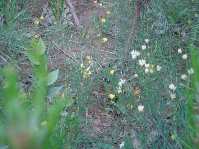也是窄窄的小道上,零零落落的野花连片连片的平铺在湿地上,星星点点的闪烁在野草中,紫的、白的、黄的、蓝的……真的好像星星啊!简单的装扮着大地,好像幽幽的萤火虫飘飘扬扬的撒下来,静静的落到地上,发着古朴的蓝光。这简单的韵味……