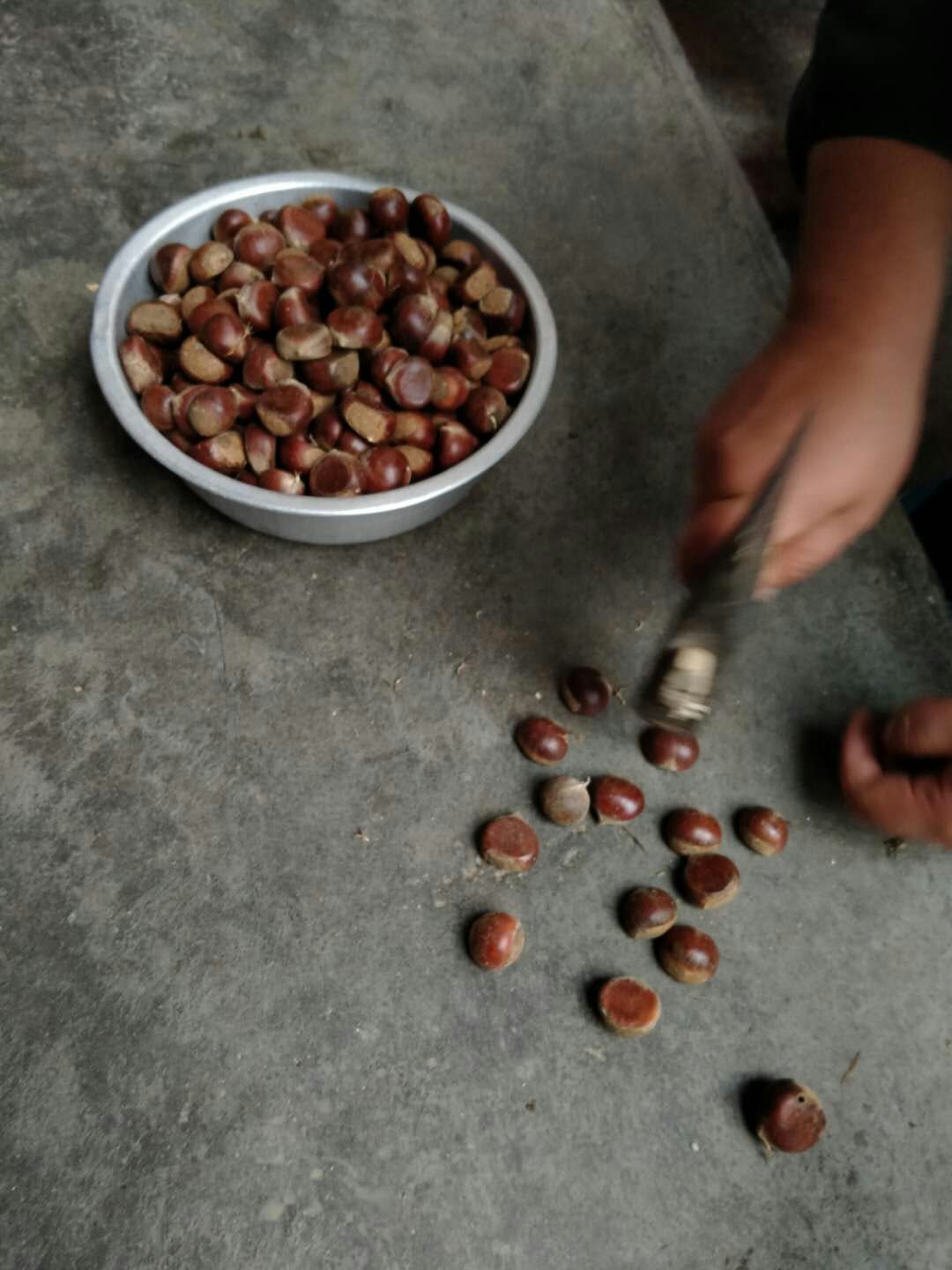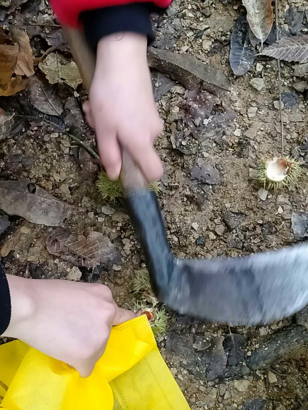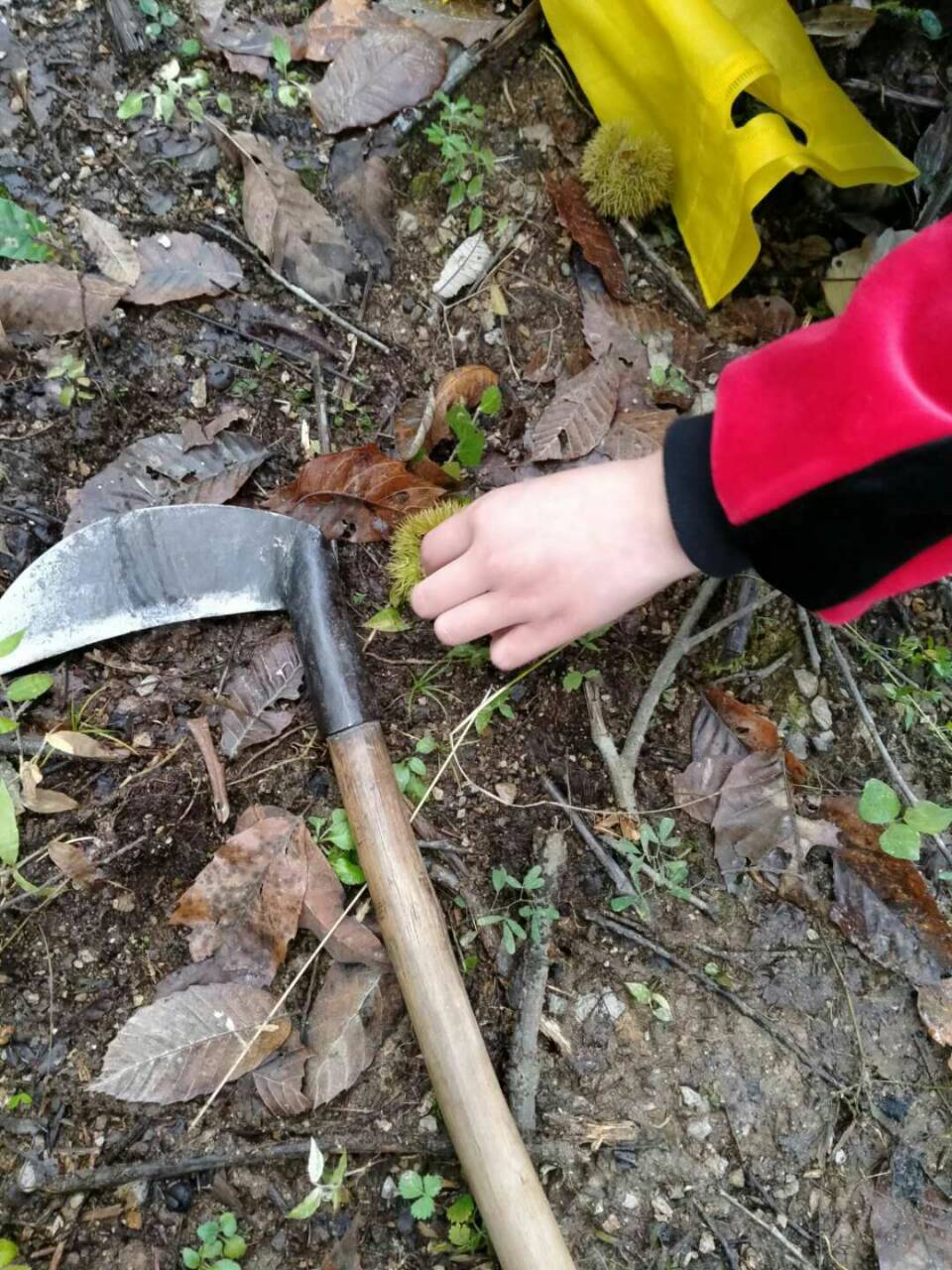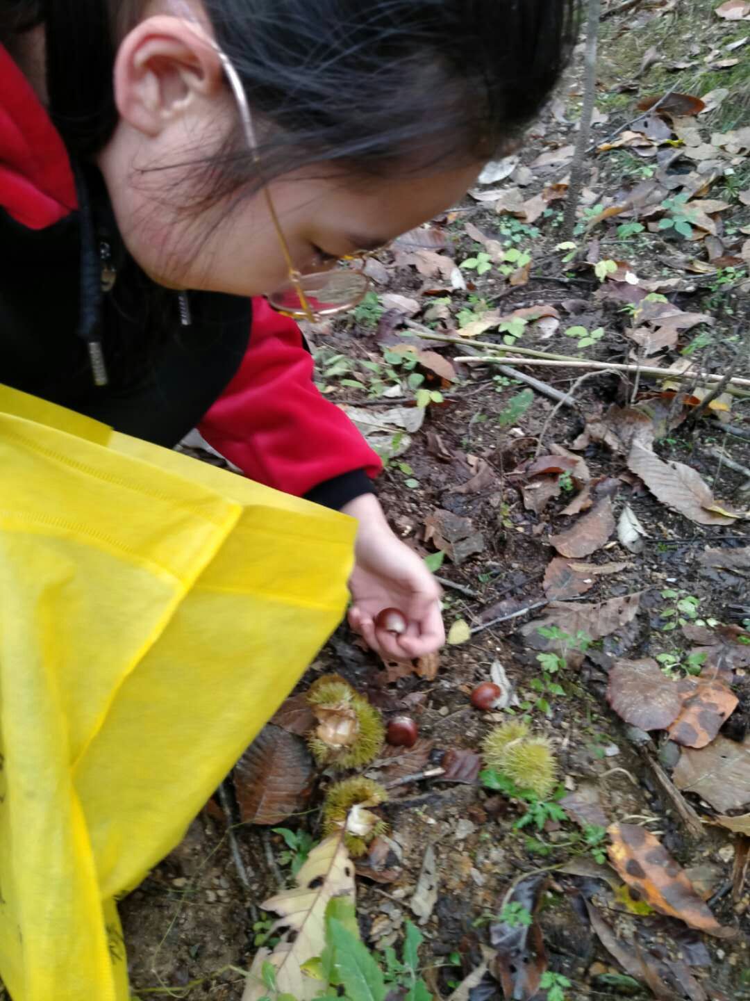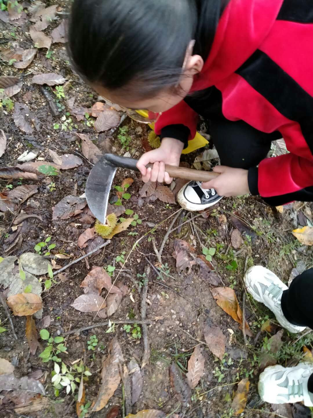 爸爸爸给我讲:"捡板栗要掌握技巧,要拿镰刀把草拨开,有些是可以直接捡的,有些板栗还裹在毛刺里,就需要用镰刀敲一下板栗,就自己蹦了出来,这样就可以捡到板栗了。但是用镰刀的时候要小心一点。"我照着爸爸教给我的方法,不一会儿就捡了一小袋.