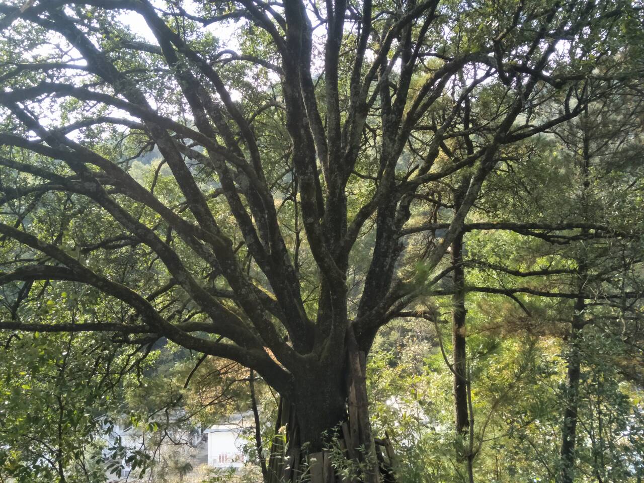 从树根到劲,只是一根树干,上去就分成了好多小树枝。夏天在树下乘凉再好不过了,下雨也可以避,虽然会淋点,至少比没有好。