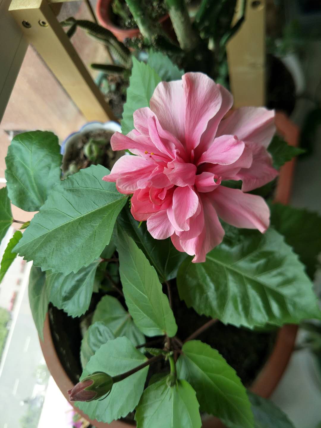 扶桑叶子互生,单叶,为掌状叶脉,花朵大且美丽,花瓣五片,先端分裂,将蕊包含在裏面,只露出五分叉的花柱,几乎最盛,花大而美丽,有绯红、淡红、桃红及黄白等色。